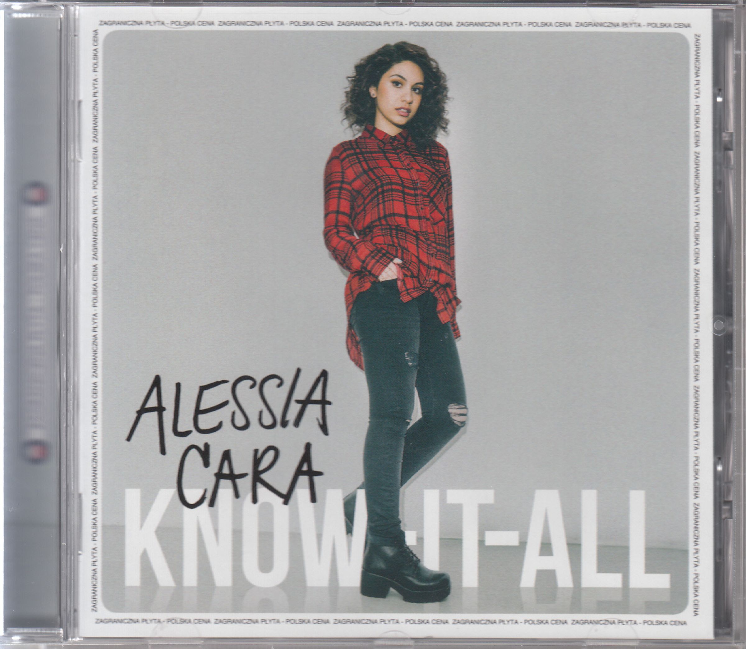 "Alessia Cara" und "Know-It-All" Text in großen Buchstaben. Junge Frau in Hemd und Jeans steht lässig vor grauem Hintergrund., CD