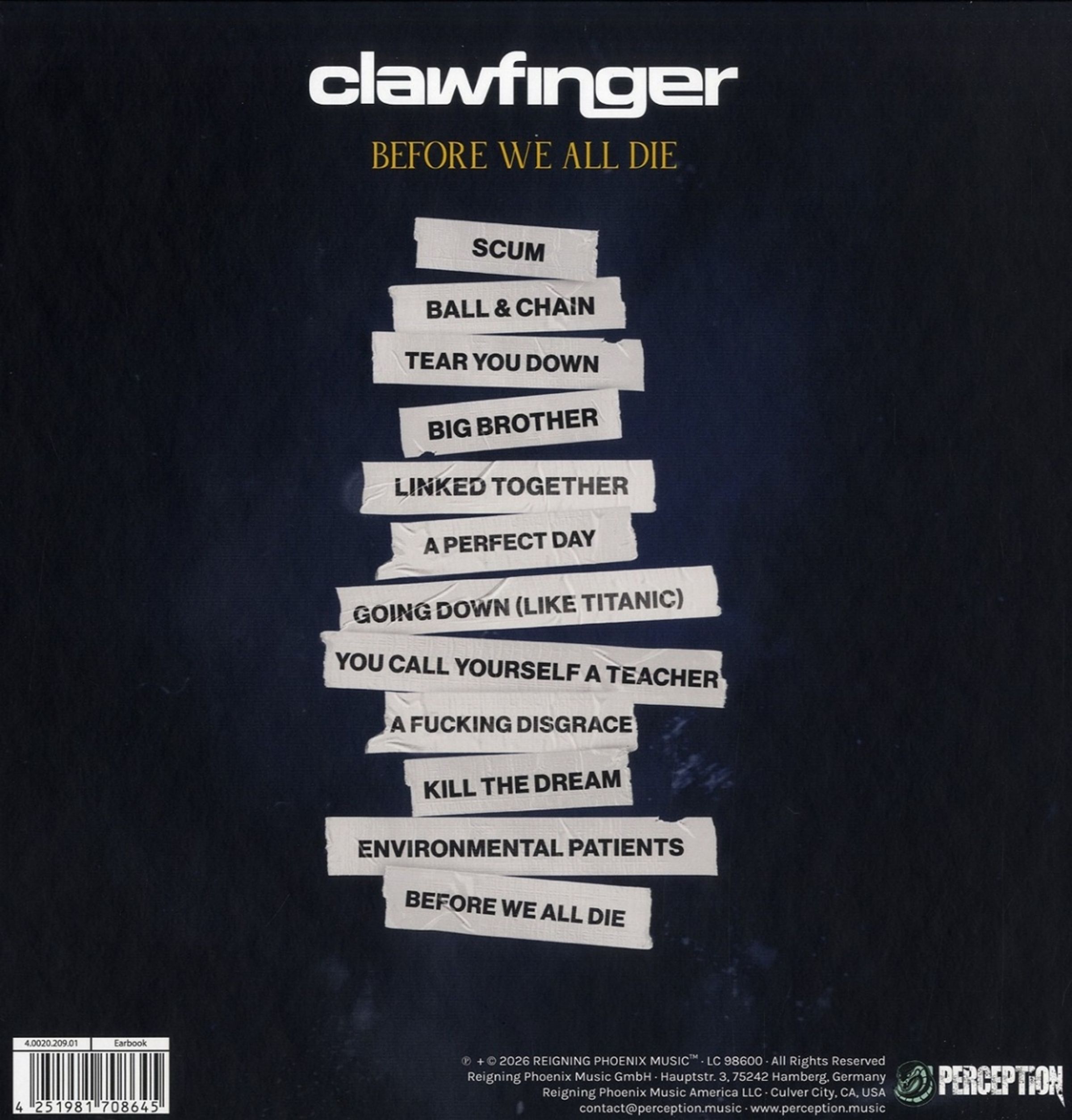 »Before We All Die« erscheint als limitiertes, 36-seitiges Earbook (30x30 cm) inkl. CD. Das CLAWFINGER »Before We All Die«-Earbook ist das ultimative Power Pack für jeden CLAWFINGER-Fan. Es enthält über 100 exklusive Bilder, Zitate, Fragerunden mit allen Bandmitgliedern, Behind-the-Scenes-Material, Autogramme, private Einblicke, Songtexte und Liner Notes. Die Premium-Version des neuen Albums!