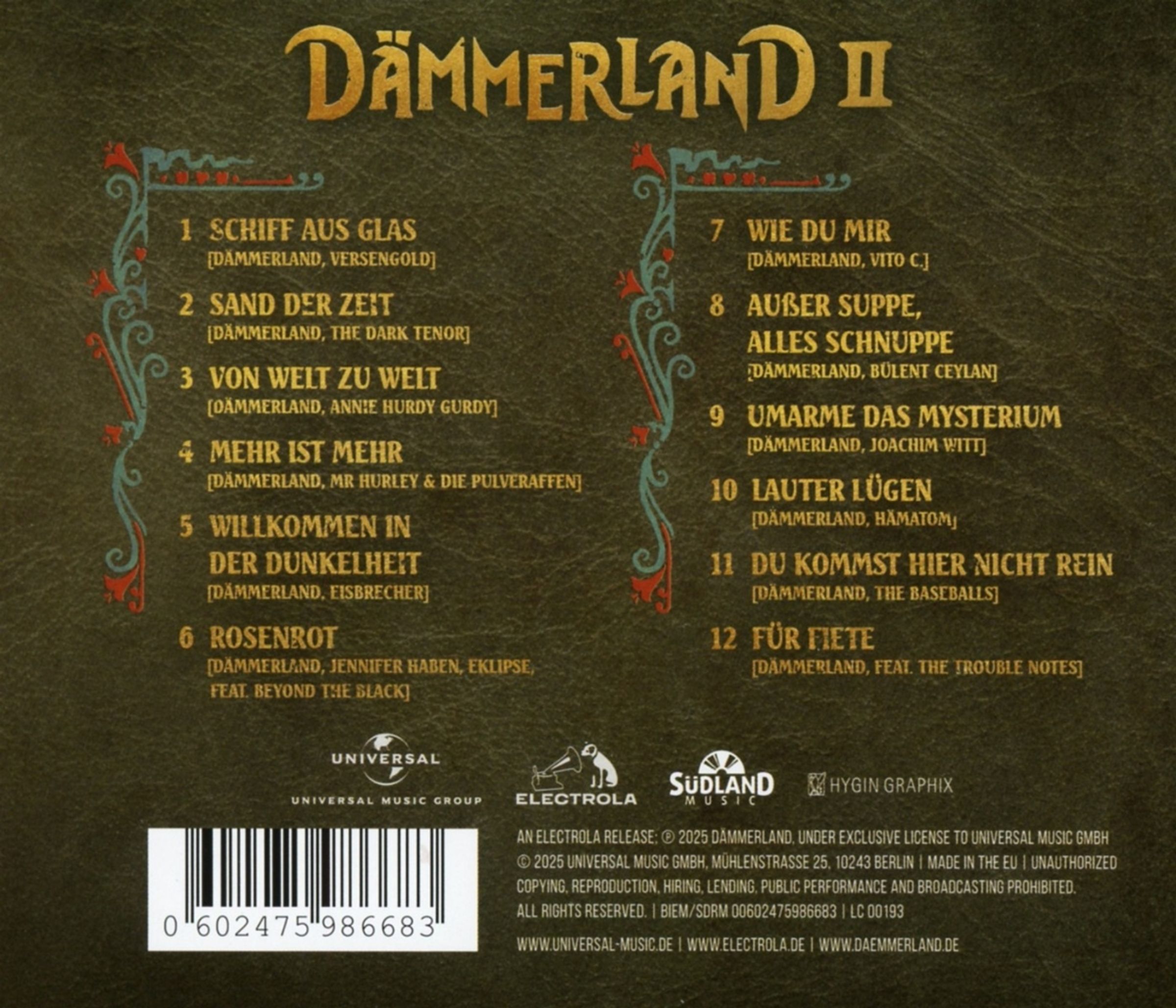 Es war der Sensationserfolg auf der Schnittstelle von Fantasy und Musik, ein epischer Meilenstein zwischen Rock-Hooks und Romanhandlung: Nachdem Malte Hoyer (Versengold) und Hannes Braun (Kissin' Dynamite) mit ihrem bahnbrechenden »Dämmerland«-Projekt erst im Herbst 2024 direkt Platz #2 der Offiziellen Deutschen Albumcharts erobern konnten, tauchen die beiden Masterminds gemeinsam mit Annie Hurdy Gurdy und etlichen hochkarätigen Special Guests ab sofort noch tiefer ein ins »Dämmerland«-Fantasy-Universum: Nun kommt der mit Spannung erwarteten Nachfolger »Dämmerland 2«!