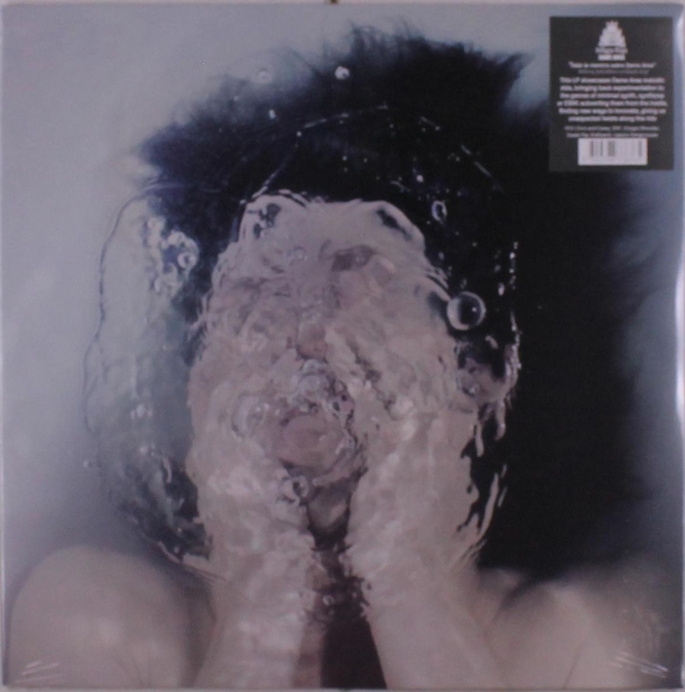 Text oben rechts: Aufkleber mit Beschreibung. Verschwommene Person mit Händen im Gesicht unter Wasser., LP