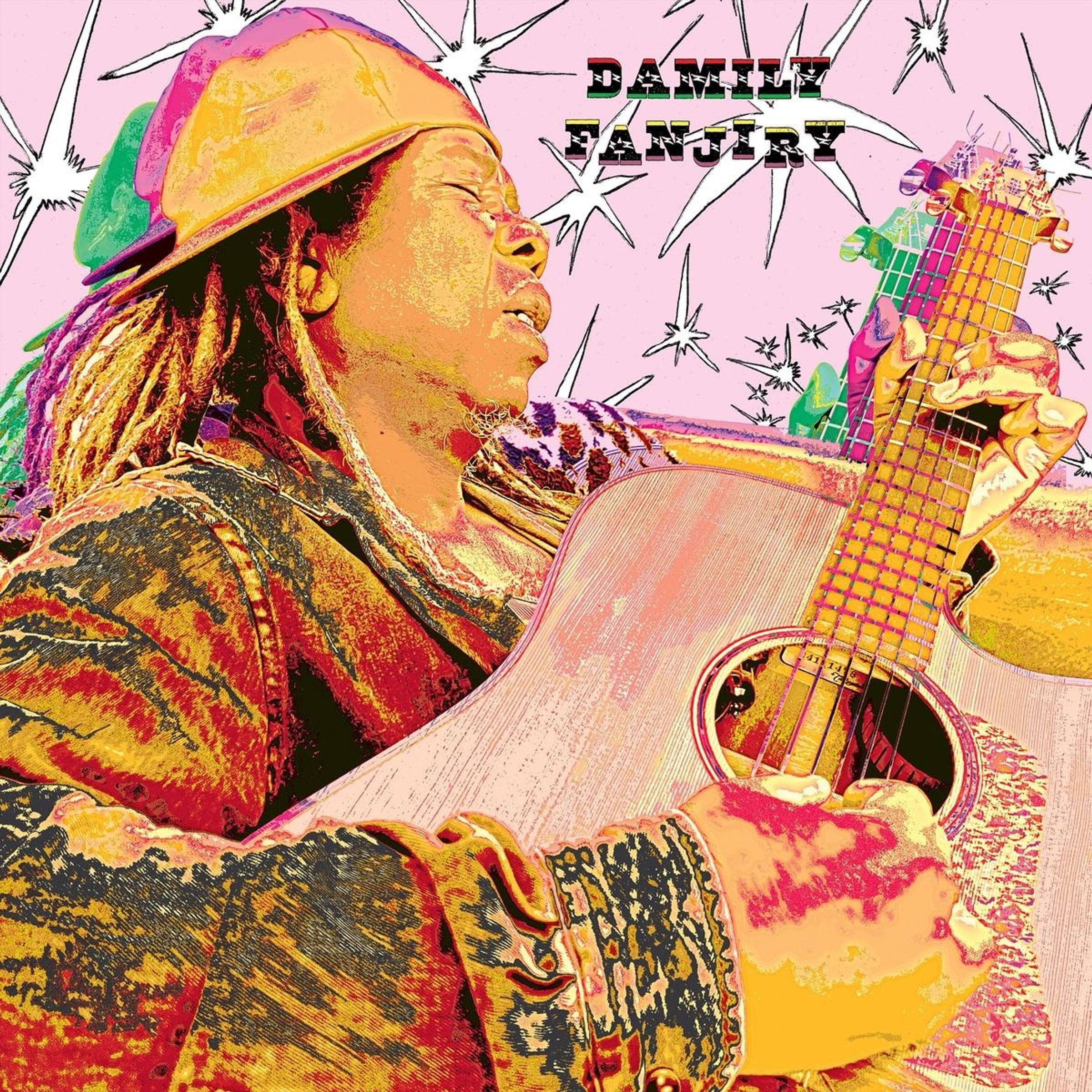Text: "DAMILY FANJIRY". Farbintensive Illustration einer Person, die Gitarre spielt, mit lebendigen Mustern im Hintergrund., LP