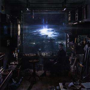 Links Text, rechts Schallplatte. Im Raum, Person sieht auf leuchtende Erde durch großes Fenster., LP