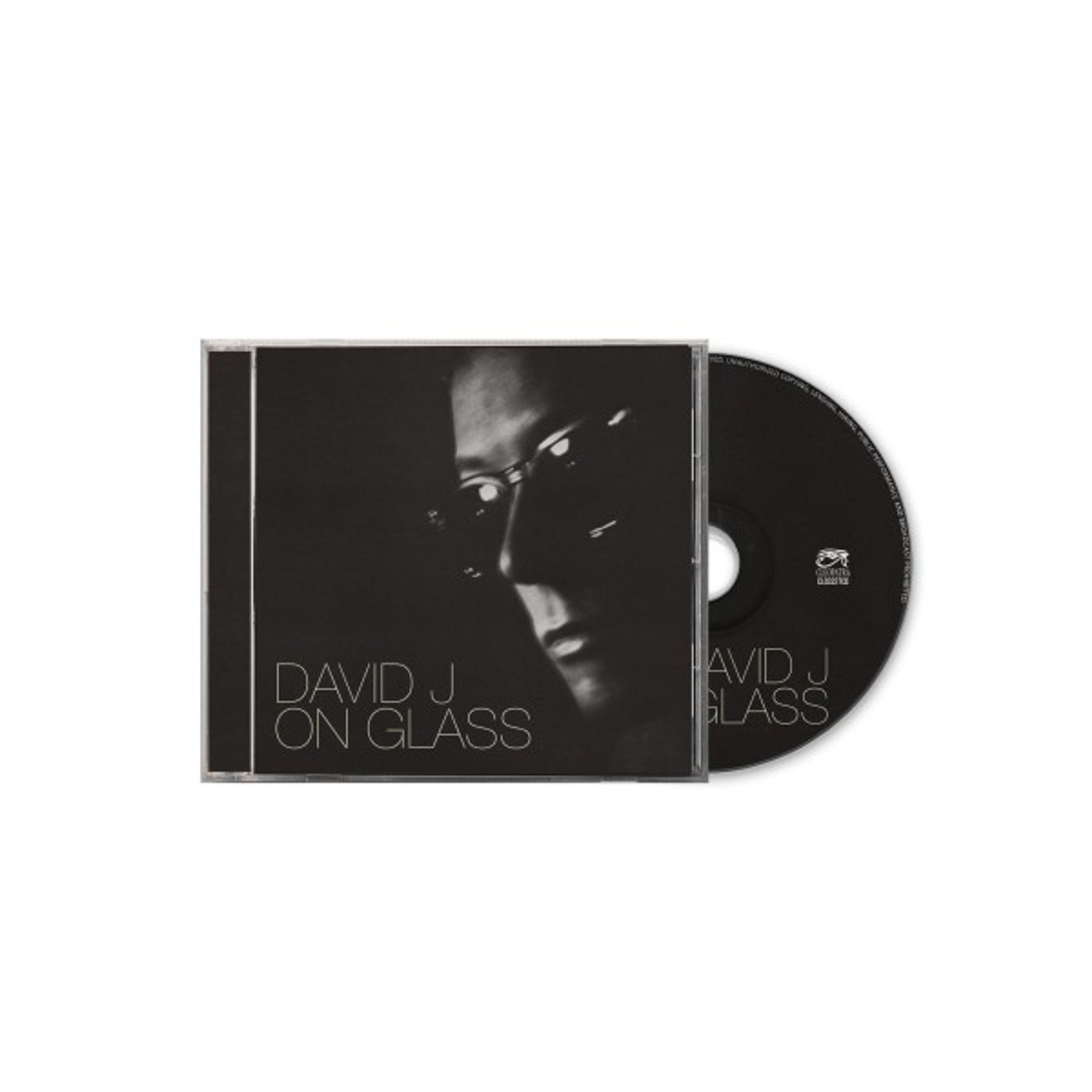 "David J On Glass" in weißer Schrift auf schwarzem Hintergrund. Ein CD-Case und die dazugehörige CD abgebildet., CD
