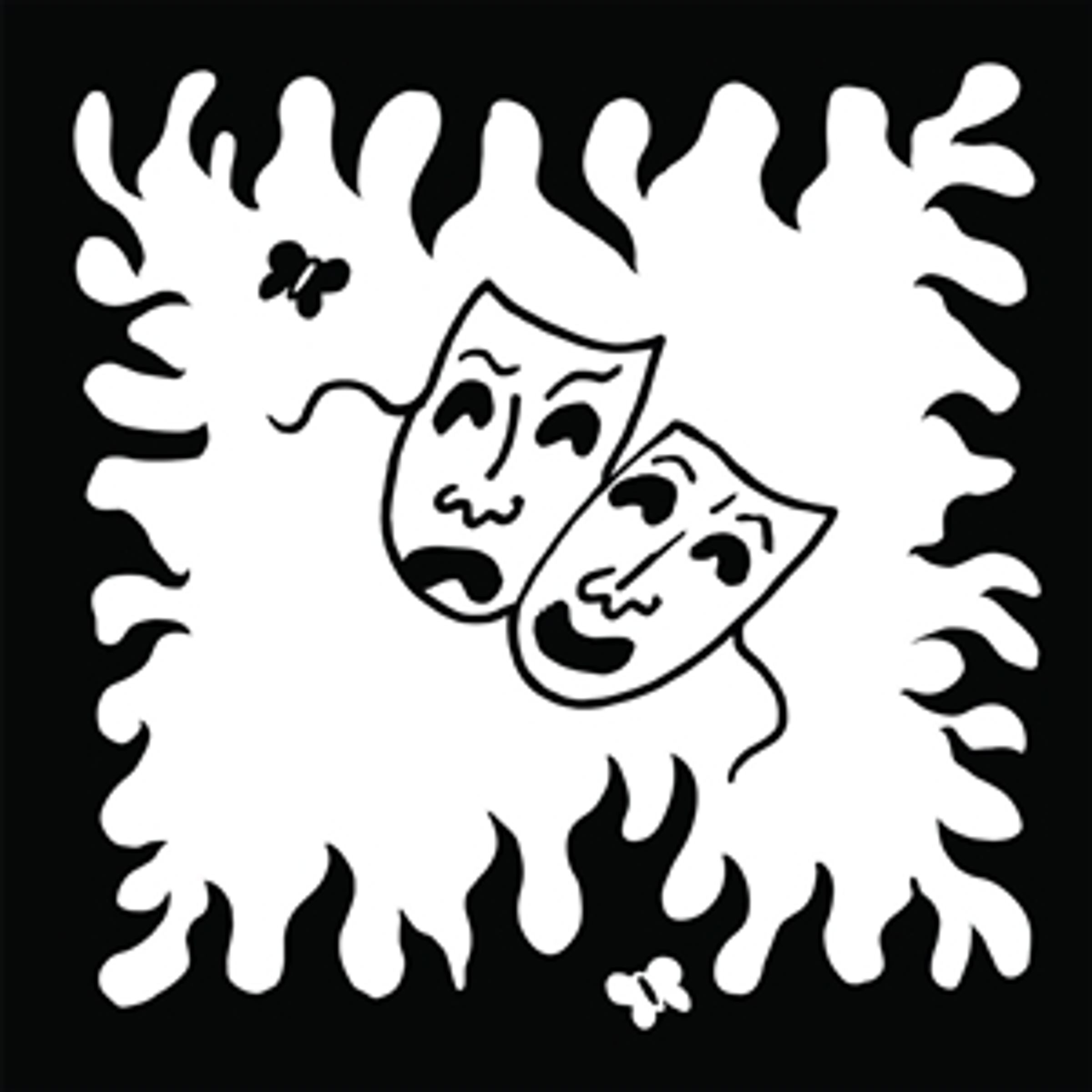 Zwei Theatermasken, eine lachend, eine traurig, umgeben von flammenden Mustern und kleinen Schmetterlingen., LP