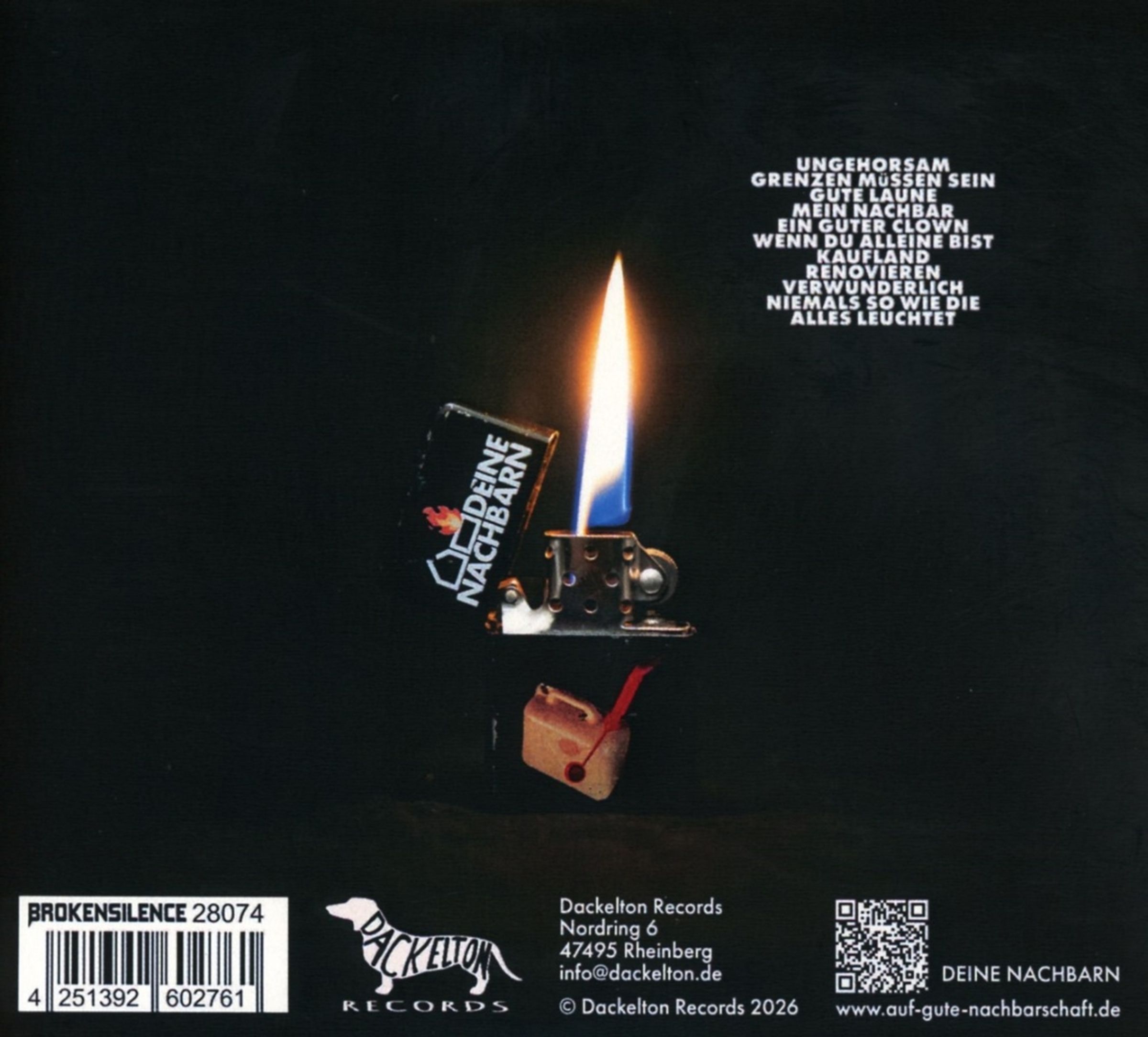 "Brandstiftung" ist das 2026 erscheinende Debütalbum des Berlin-Neuköllner Punk- und Singer-Songwriter-Trios Deine Nachbarn. "Brandstiftung" ist eine Umarmung für all die, die sich auch so oft nicht "normal” fühlen. Allein bist du nicht, sagt dieses Album.
