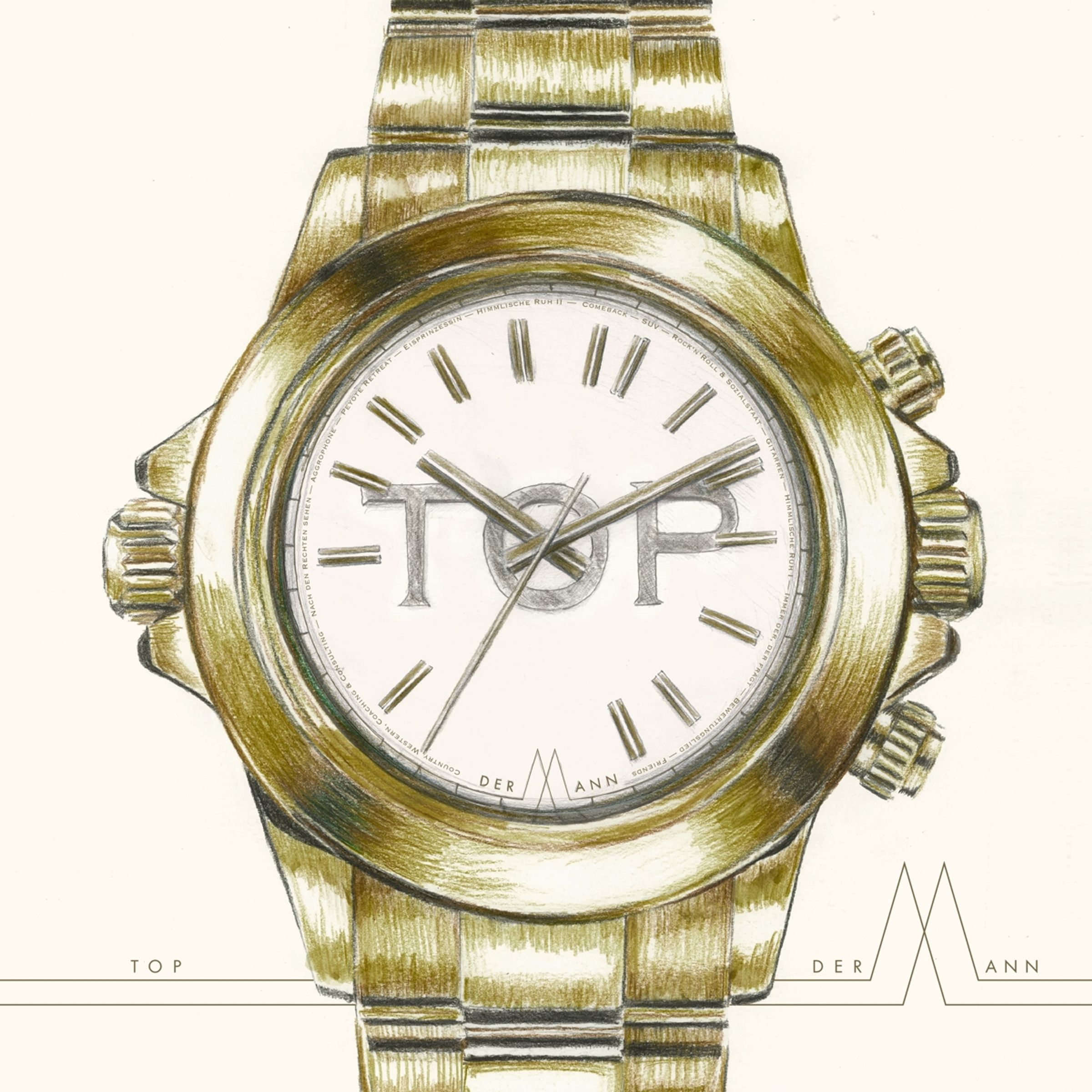 Was Der Mann auf TOP jedoch thematisieren, ist eindeutig heutig. Es geht um Oberflächen-Phänomene. Im flotten Opener »SUV« und dem zum Offbeat schunkelnden »Bewertungslied« etwa um das fortwährende Hypen, Rummeinen und Raunen in den sozialen Medien. Es geht, im nachdenklich-sanften »Country, Western, Coaching & Consulting« oder im Postpunk-Boogie-Hybrid »Peyote Retreat« um psychedelische Techniken, die mal subversiv waren, aber mittlerweile längst von Konzernen zur Mitarbeitermotivation und Umsatzsteigerung aufgesogen wurden. Und es geht um den Staat, der sich mit Fördergeldern und Stipendien eine die sie füttert, überhaupt noch interessiert, ob sie nun gebissen wird oder nicht.