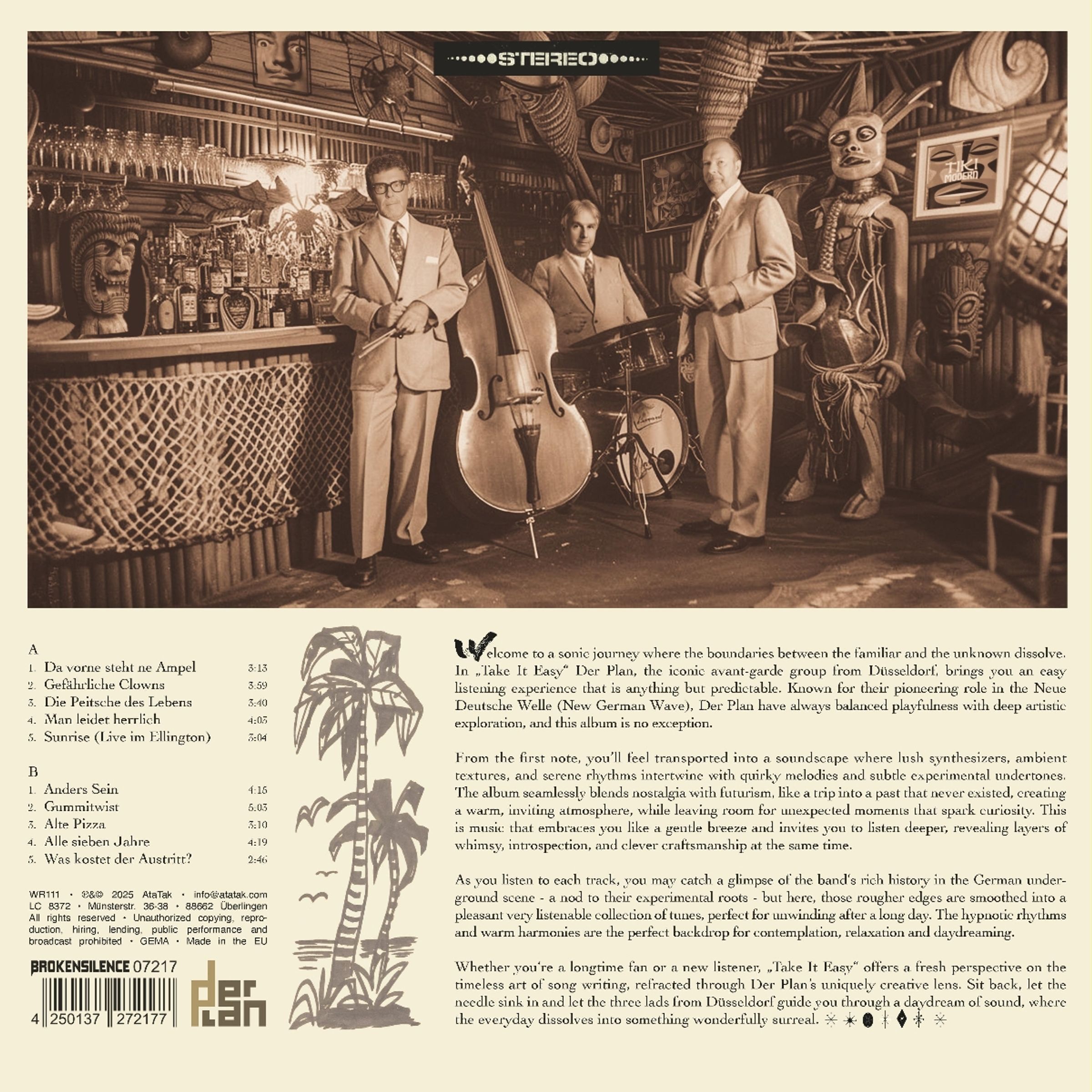 Die Düsseldorfer Avantgarde-Band und NDW-Legende Der Plan präsentiert 2025 auf dem bandeigenen Label Ata Tak mit »Take It Easy!« zehn neu eingespielte Klassiker als CD und Vinyl-LP.