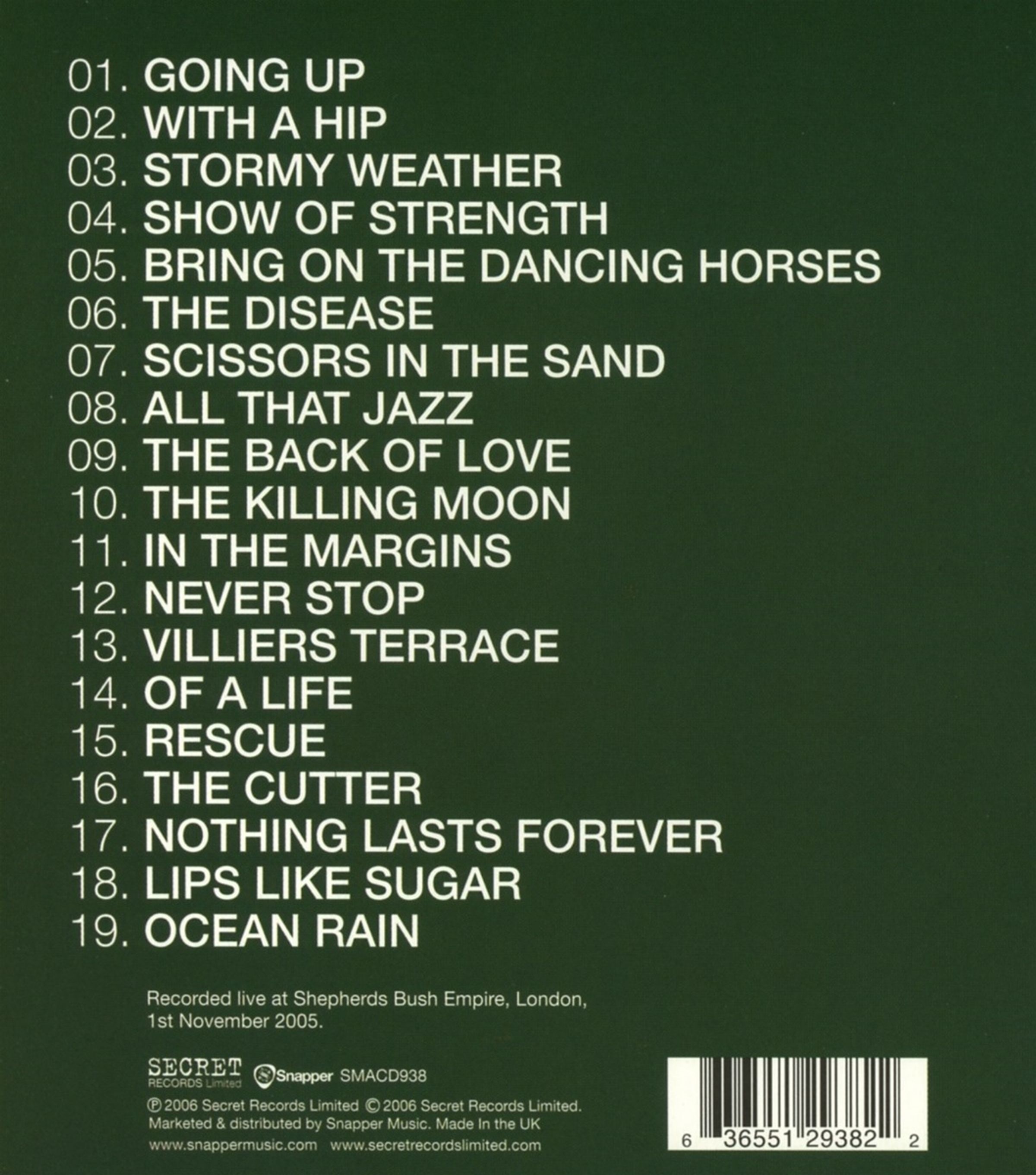 Aufgenommen live im Shepherds Bush Empire London am 1. November 2005 und mit den Hitsingles: The Cutter, Killing Moon, Bring on The Dancing Horses, Back of Love, Never Stop, Seven Seas und Nothing Lasts Forever.