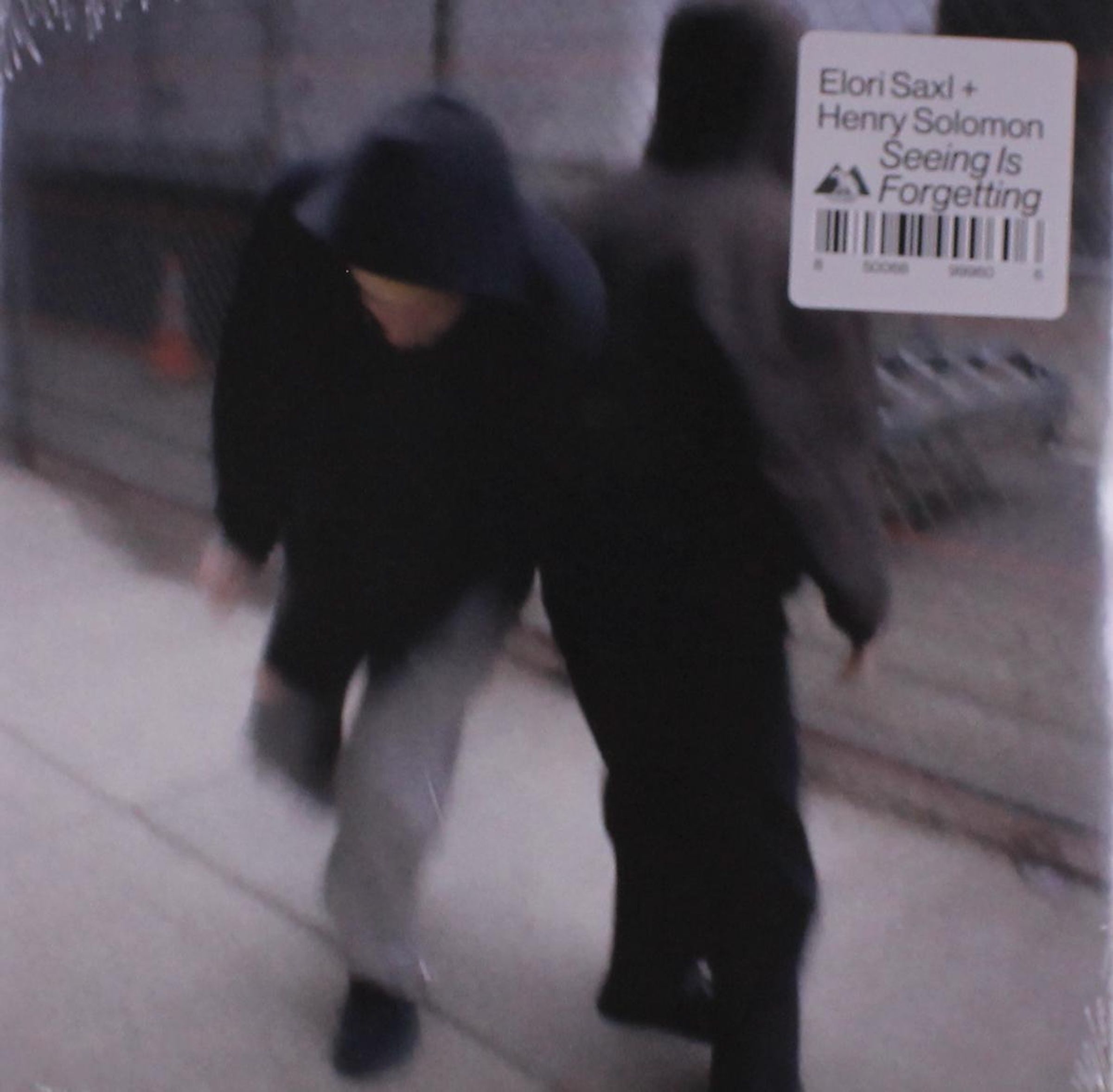 Aufkleber mit „Elori Saxl + Henry Solomon – Seeing Is Forgetting“. Zwei Personen in dunkler Kleidung, unscharf, gehen., LP