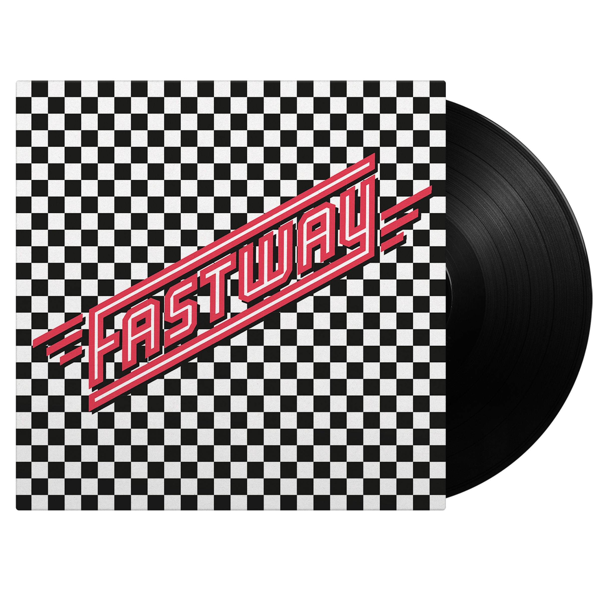 Der Text "FASTWAY" steht schräg über einem schwarz-weiß karierten Muster. Ein Schallplattenrand ist seitlich sichtbar., LP