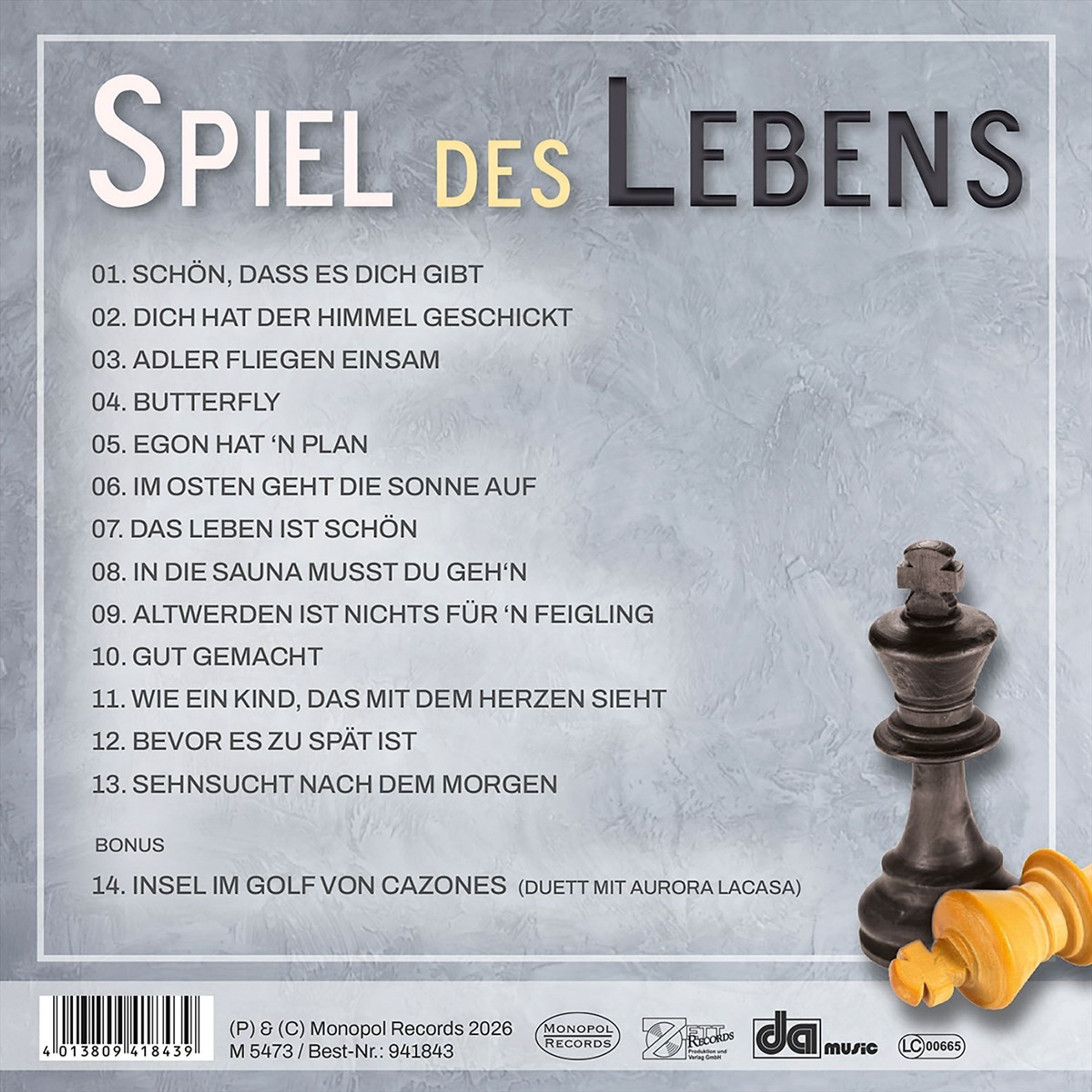 Frank Schöbel – ein Sänger, der das Spiel des Lebens genau kennt und es musikalisch meisterhaft erzählt. Der in Berlin-Köpenick lebende Entertainer singt über das, was uns alle bewegt: Über Liebe und Dankbarkeit, über Hoffnung, Abschied und Neubeginn, über das Älterwerden und darüber, dass das Leben trotz allem schön ist. „Spiel des Lebens“ erzählt von Höhen und Tiefen, von leisen Gedanken und lauten Lachern, von Zuversicht und Menschlichkeit.
