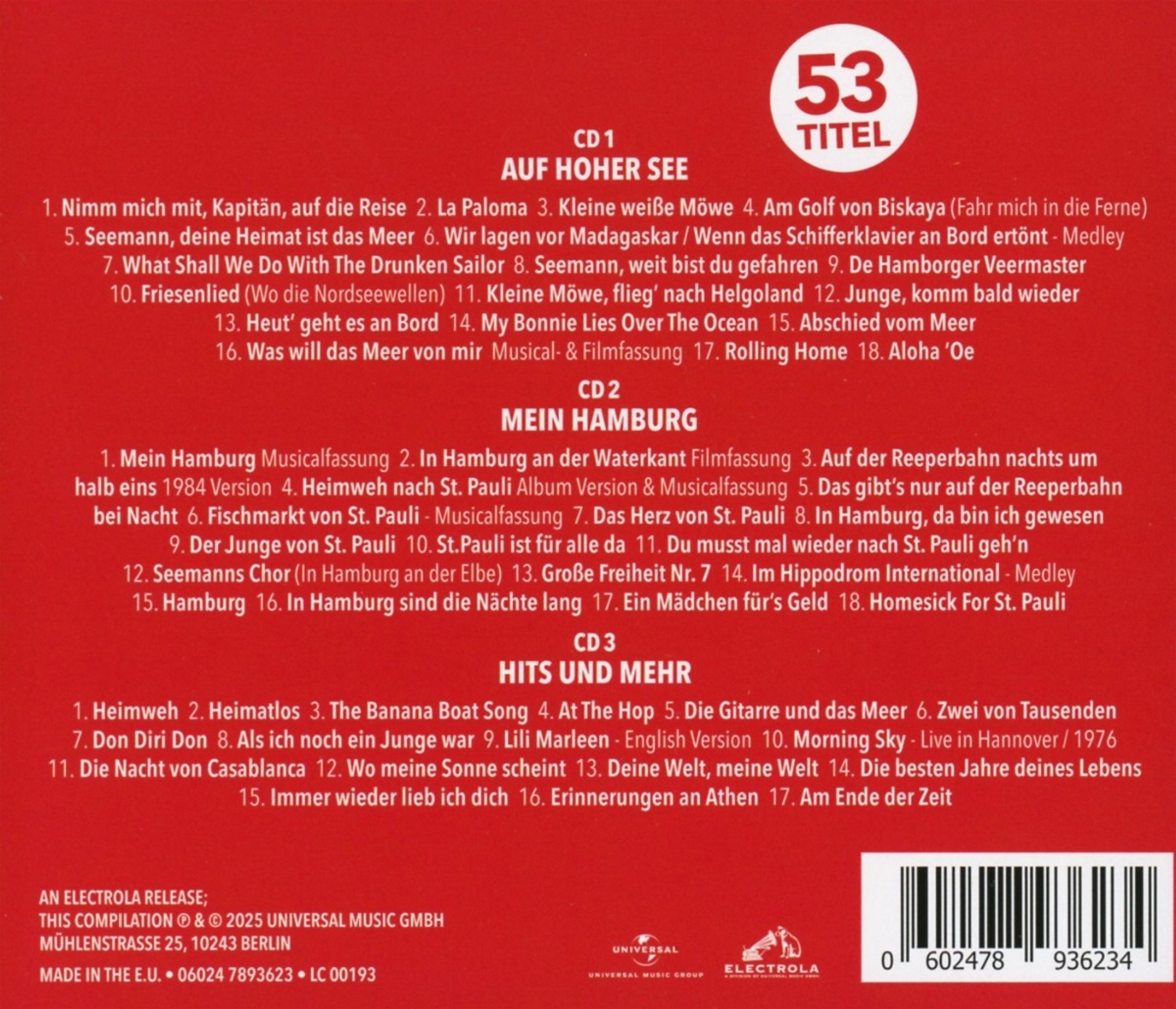 Titel, die in dieser Box natürlich nicht fehlen dürfen. Andere Songs waren schon Evergreens, als Freddy Quinn sie aufnahm, sie praktisch nochmal veredelte, in dem er ihnen seinen unverwechselbaren musikalischen Stempel aufdrückte. »Wo meine Sonne scheint«, »Lili Marleen« oder »What shall we do with the drunken sailor« gehören dazu und sind natürlich in dieser CD-Box enthalten! Die 3 CDs dieser wertvollen Box sind aufgeteilt in »Auf hoher See«, »Mein Hamburg« und »Hits und mehr«.