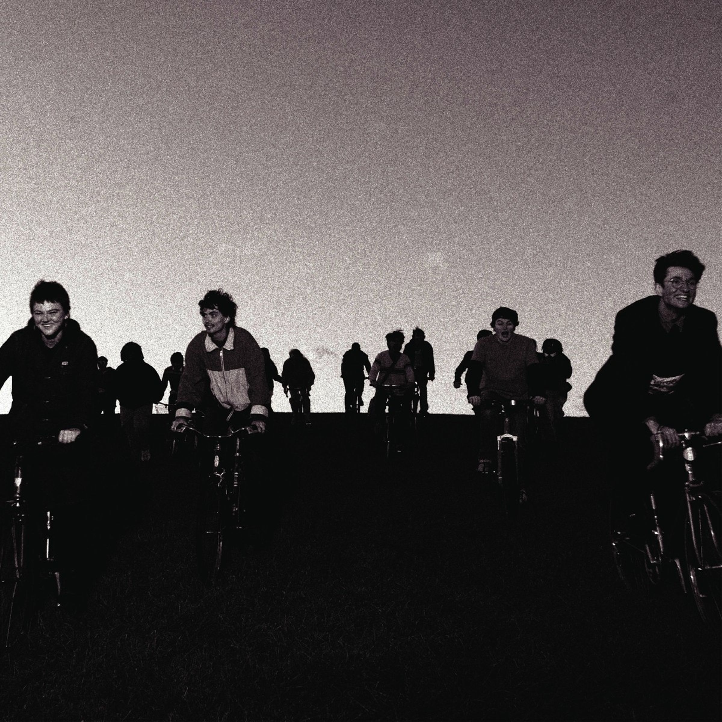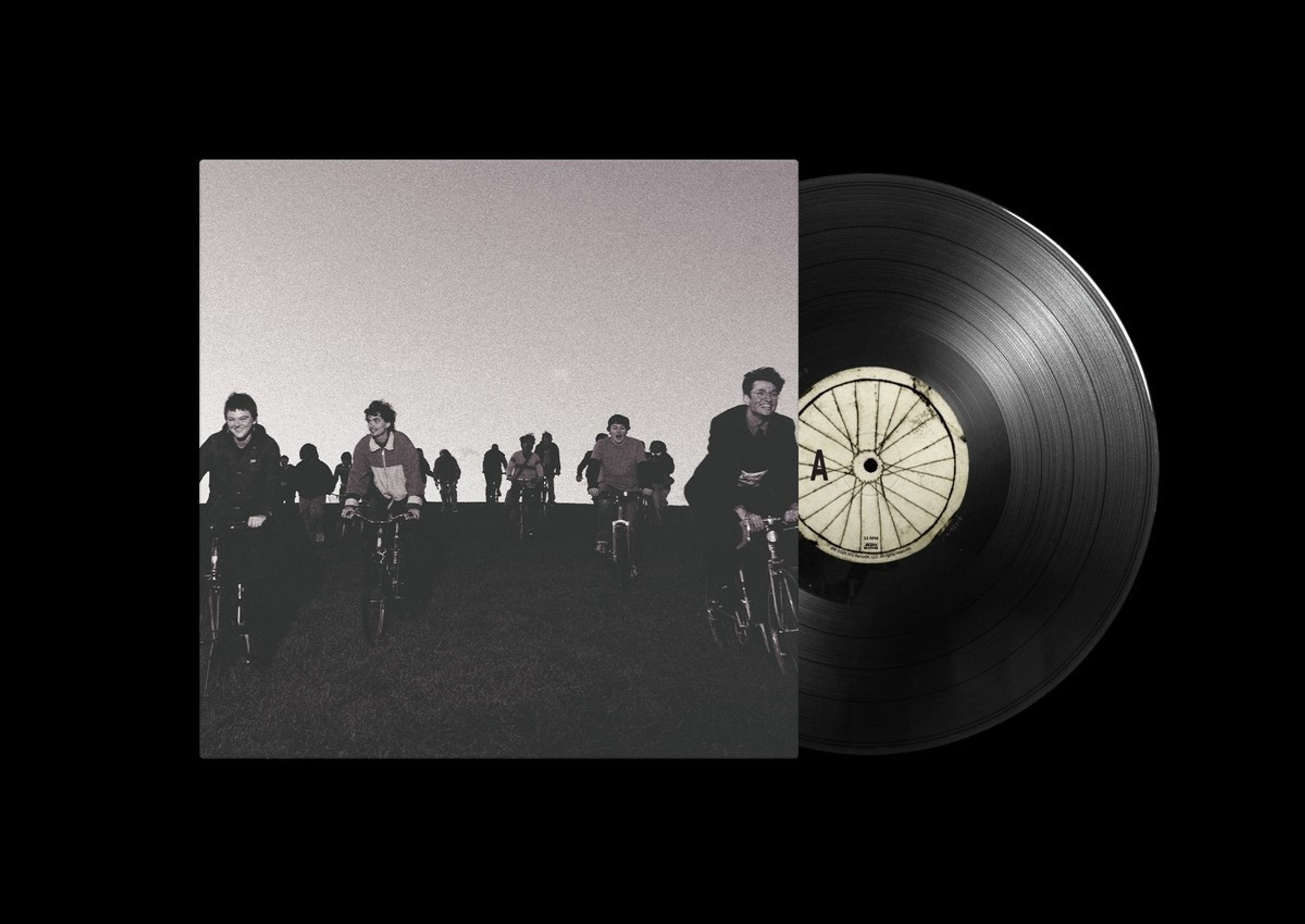 Ich kann darauf nicht viel Text erkennen. Mehrere Menschen fahren fröhlich auf Fahrrädern den Hügel hinunter., LP