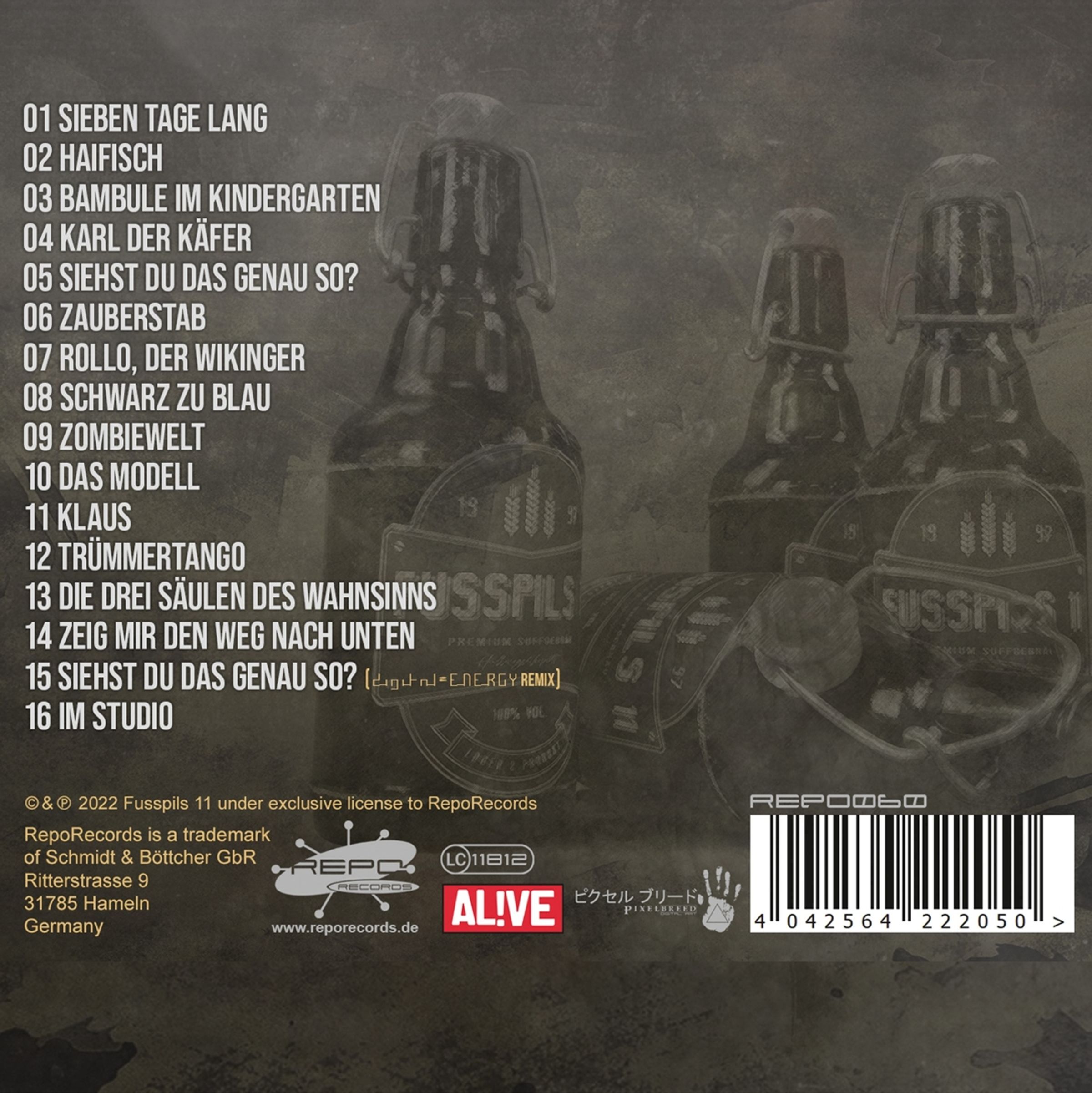 Für jede Flasche hat Gerrit Thomas die passende Maische gefunden, so lässt er u. a. Bastian Polak (Intent: Outtake) Haifisch von Rammstein abfüllen, Tim Schulschenk (Alienare) Siehst du das genau so? von Sportfreunde Stiller und Jan Bertram (Eisfabrik) Schwarz zu Blau von Peter Fox. Und dennoch befinden sich auch ein paar, eigens für Fußpils 11 geschriebene Songs, welche erklären könnten, wie eine Fabrik am Laufen gehalten wird oder warum eine TV bekannte Profiboxerin zum Boxen gekommen ist.