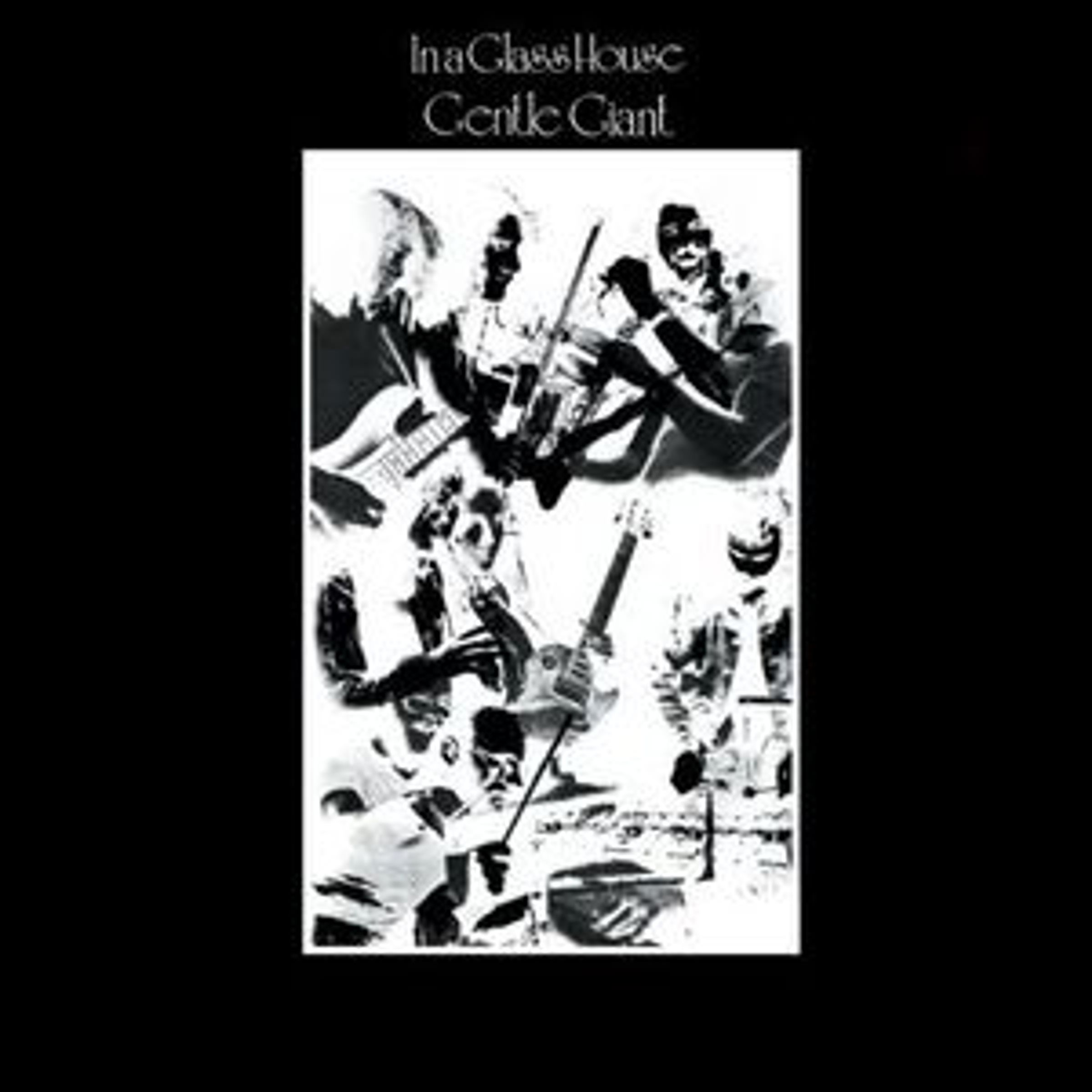 "In a Glass House, Gentle Giant." Schwarz-weißes, abstraktes und gestreutes Bild von Musikern und Instrumenten., CD