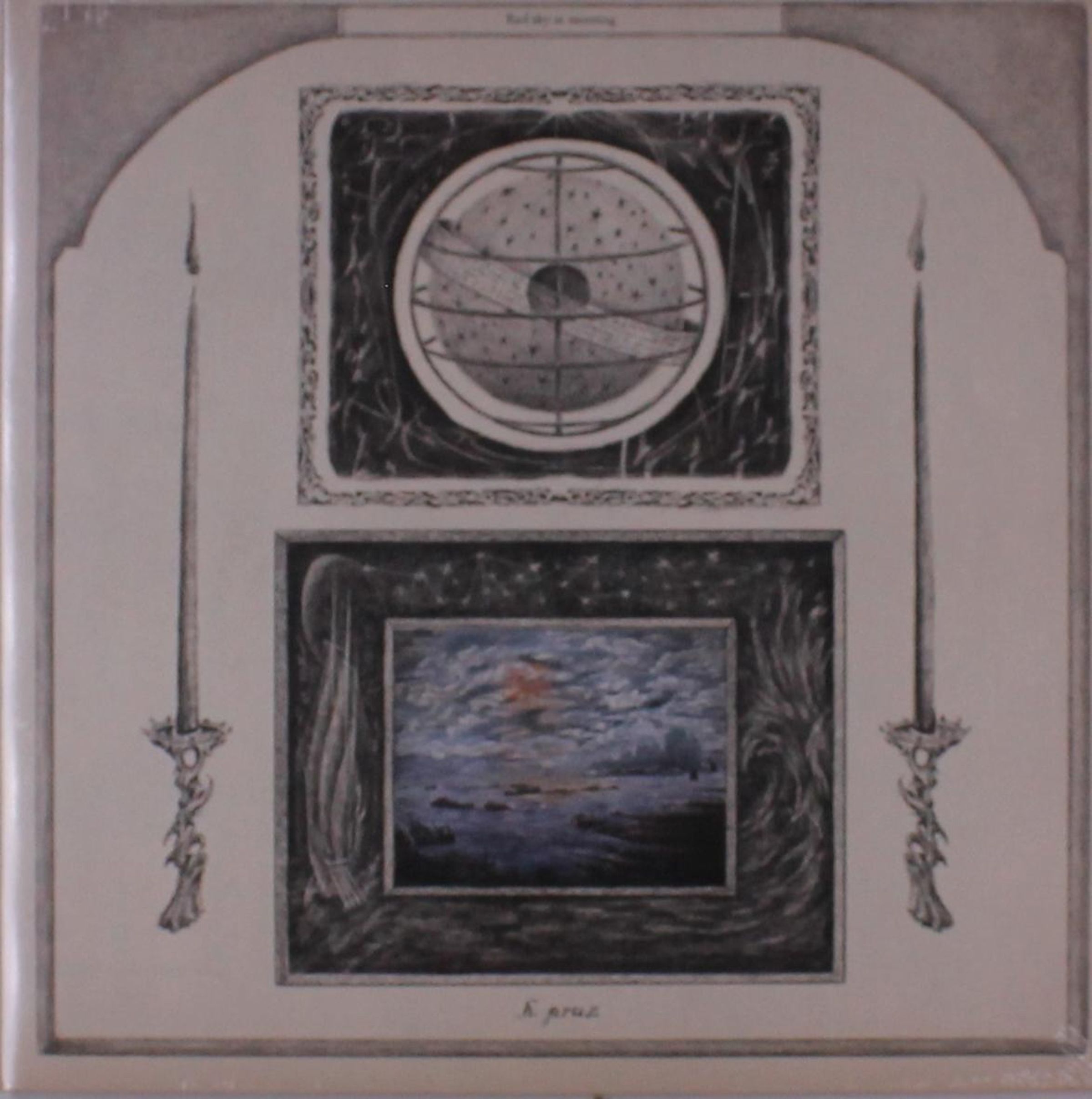 "Red sky in evening" oben, "A grave" unten. Illustration: Kreisform oben, Landschaftsszene unten, flankiert von zwei Schwertern., LP