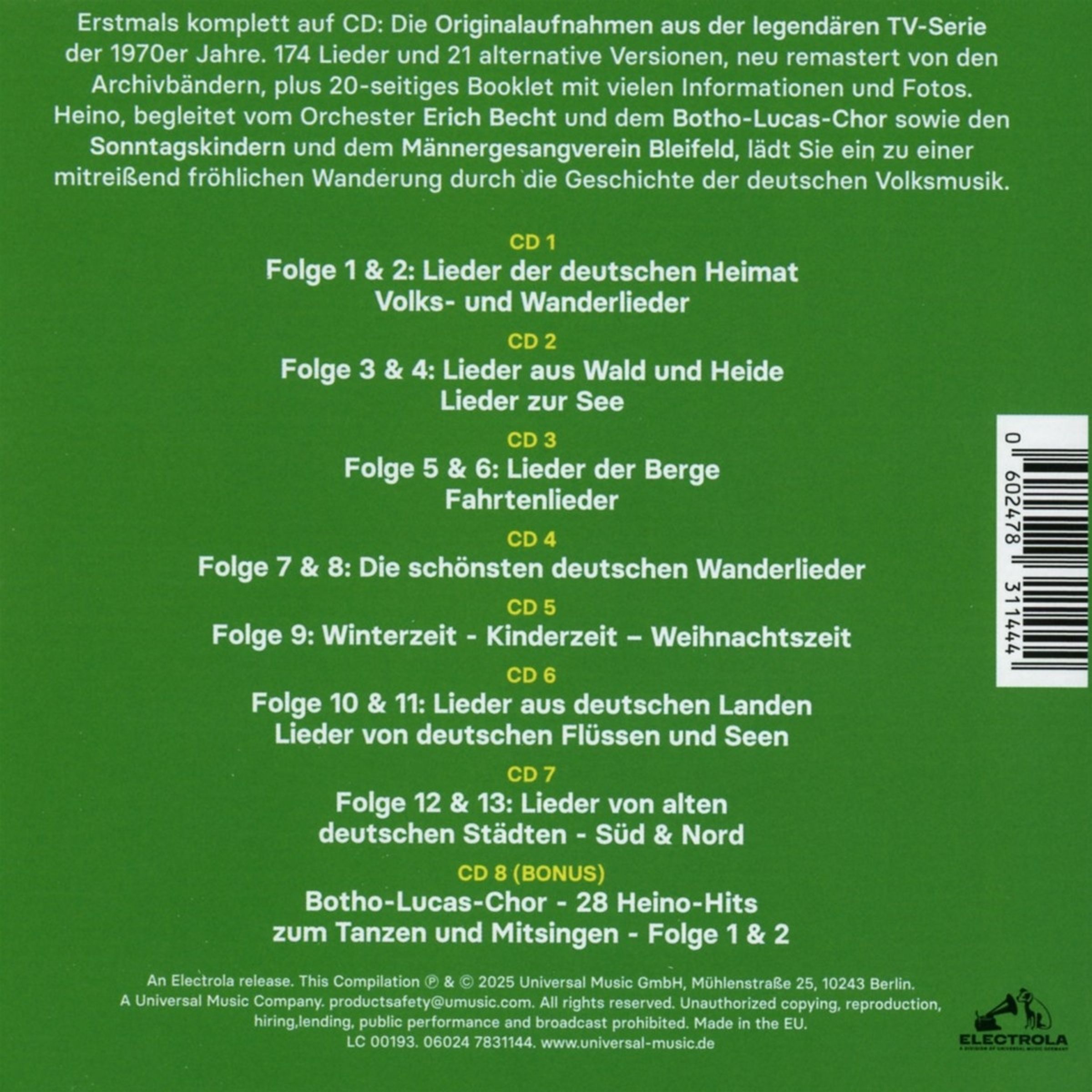 In einer schicken CD-Box im Original-Artwork versammeln sich hier erstmals komplett und brandneu remastered 174 Lieder plus 21 alternative Versionen auf 7 CDs, gekrönt von einem 20-seitigen Booklet mit vielen Informationen und Fotos sowie einer Bonus-CD mit Heino-Songs gesungen von seinen Freunden vom Botho-Lucas-Chor. Kommen Sie mit auf eine mitreißend fröhliche, zeitlose Wanderung durch die Geschichte der deutschen Volksmusik. Heino ist und bleibt der Größte!
