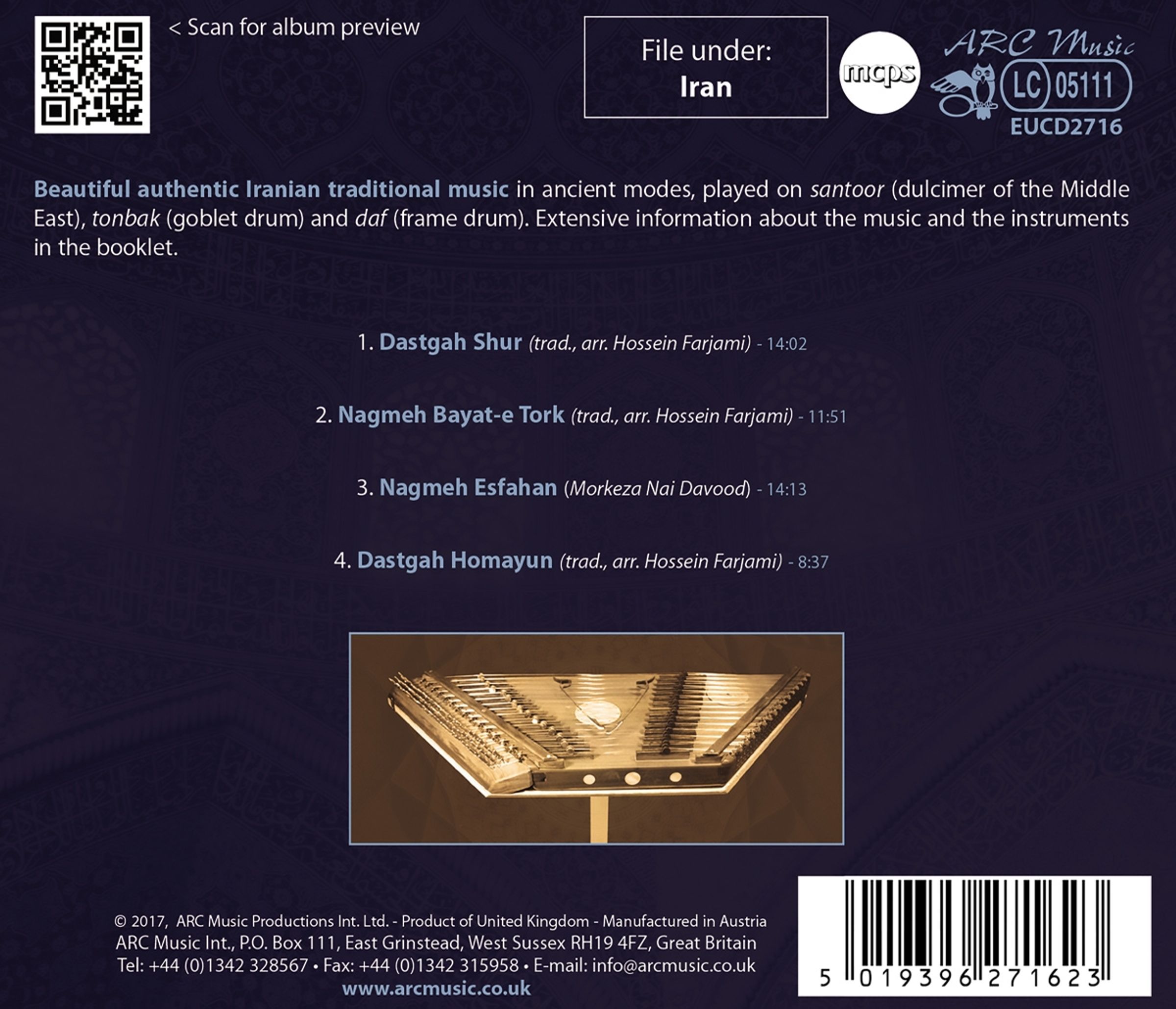 Der in Teheran geborene Hossein Farjami, Virtuose der Santoor, eines Hackbretts aus dem Nahen Osten und Trommeln aus dem Nahen Osten, präsentiert wunderschöne, authentische iranische Volksmusik in alten Modi, gespielt auf Santoor, Tonbak (Bechertrommel) und Daf (Rahmentrommel). Informationen zu den Musikstücken und Instrumenten im Booklet.