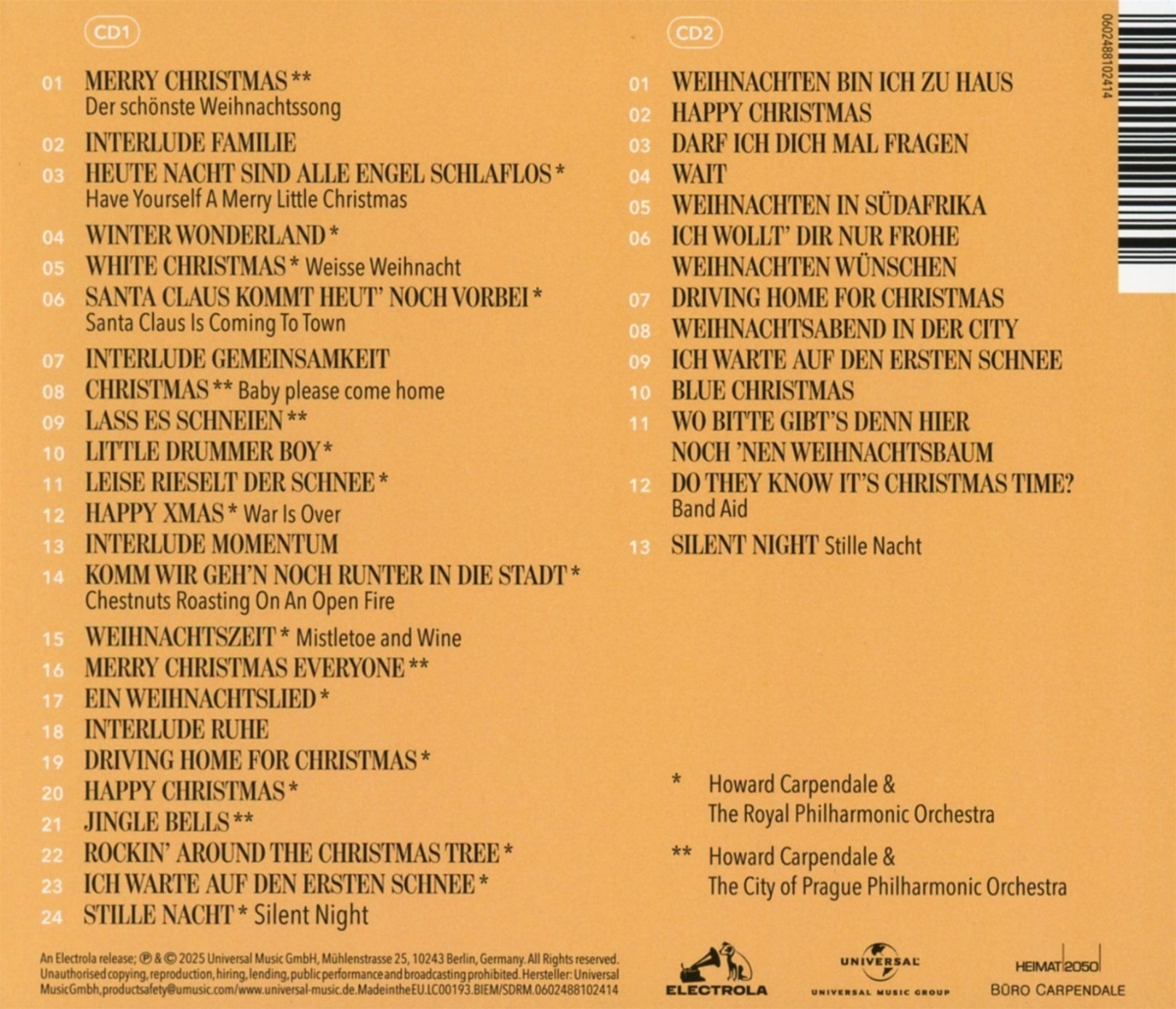 Erweitert um neue Musik – und persönliche Botschaften zum Jahresausklang: Die kommende ReEdition »Happy Christmas… Again!« von Howard Carpendale sorgt pünktlich zum ersten Adventswochenende für besinnliche Momente und wunderschön orchestriertes Weihnachtsfeeling. Unter anderem auch als karriereübergreifende Deluxe-Edition (inkl. dem ersten Weihnachtsalbum von 2001!) erhältlich, erscheint die ReEdition in drei Konfigurationen.