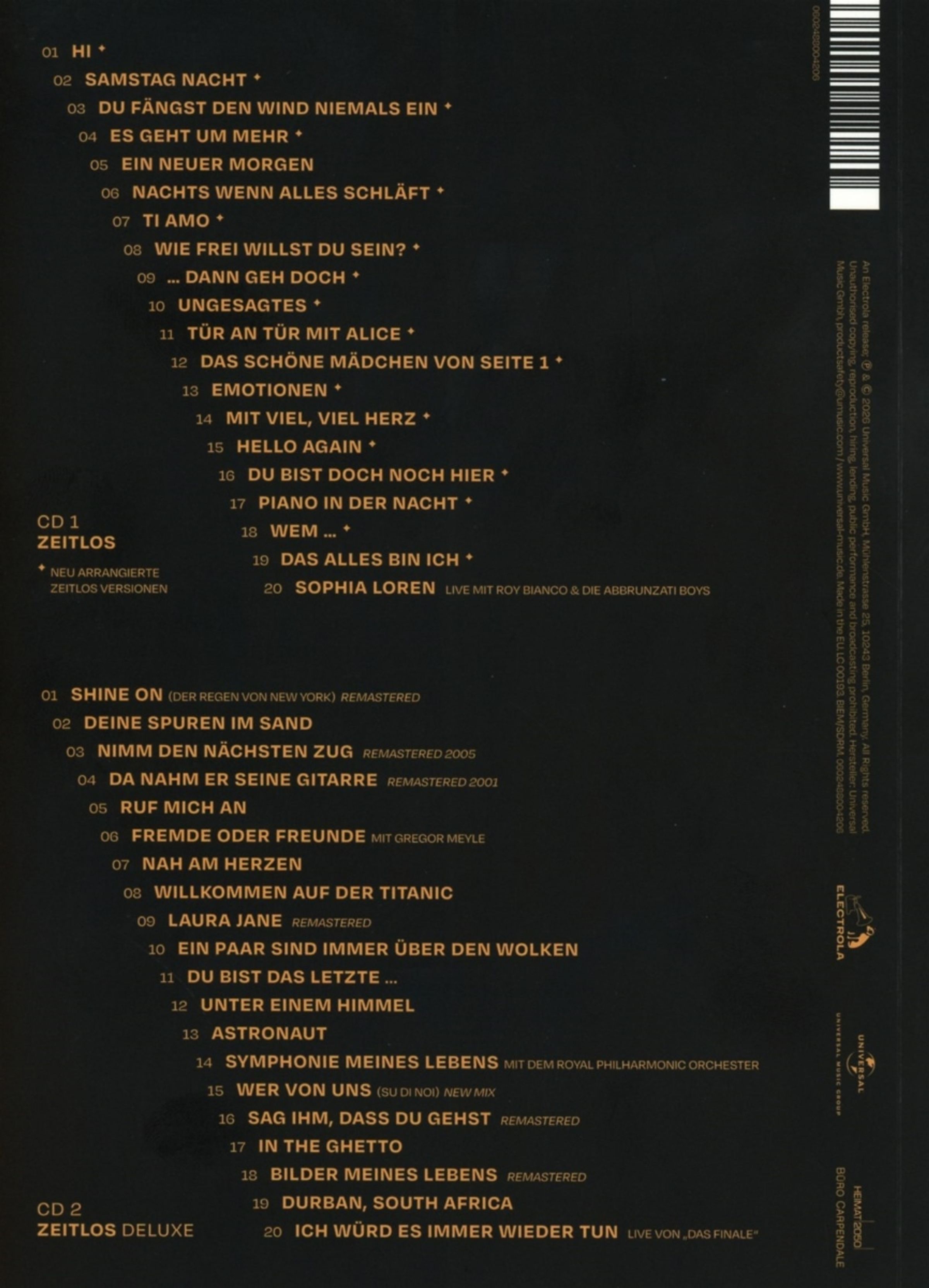Das Jubiläumsalbum »Zeitlos«, das pünktlich zum runden Geburtstag erscheint, bietet packende Neuaufnahmen seiner allergrößten Hits – ein ganz besonderes Geschenk, das der Entertainer sich und seinen Fans macht. Erweitert um einige neue Kompositionen (etwa die jüngste Single »Ein neuer Morgen«), vereint »Zeitlos« nur die allergrößten Hits im neuen zeitlosen Mix.
