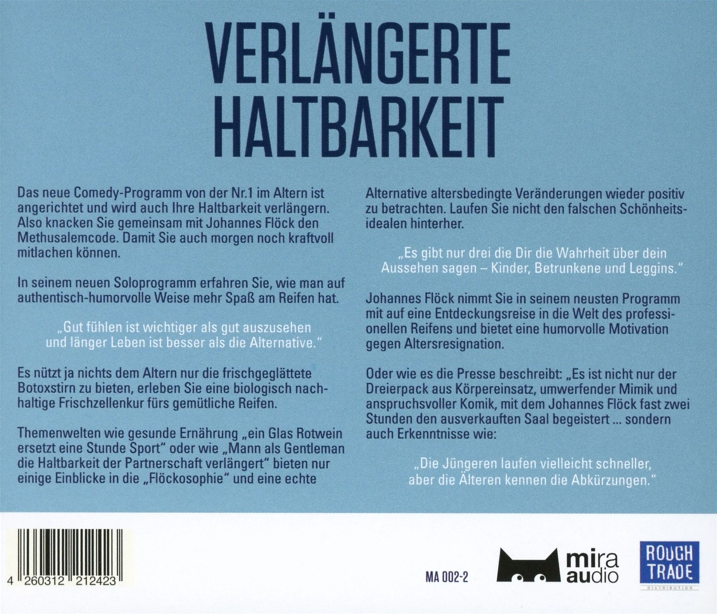 Das neue Comedy-Programm von der Nr. 1 im Altern ist angerichtet und wird auch Ihre Haltbarkeit verlängern. Also knacken Sie gemeinsam mit Johannes Flöck den Methusalemcode. Damit Sie auch morgen noch kraftvoll mitlachen können. In seinem neuen Soloprogramm erfahren Sie, wie man auf authentisch-humorvolle Weise mehr Spaß am Reifen hat.