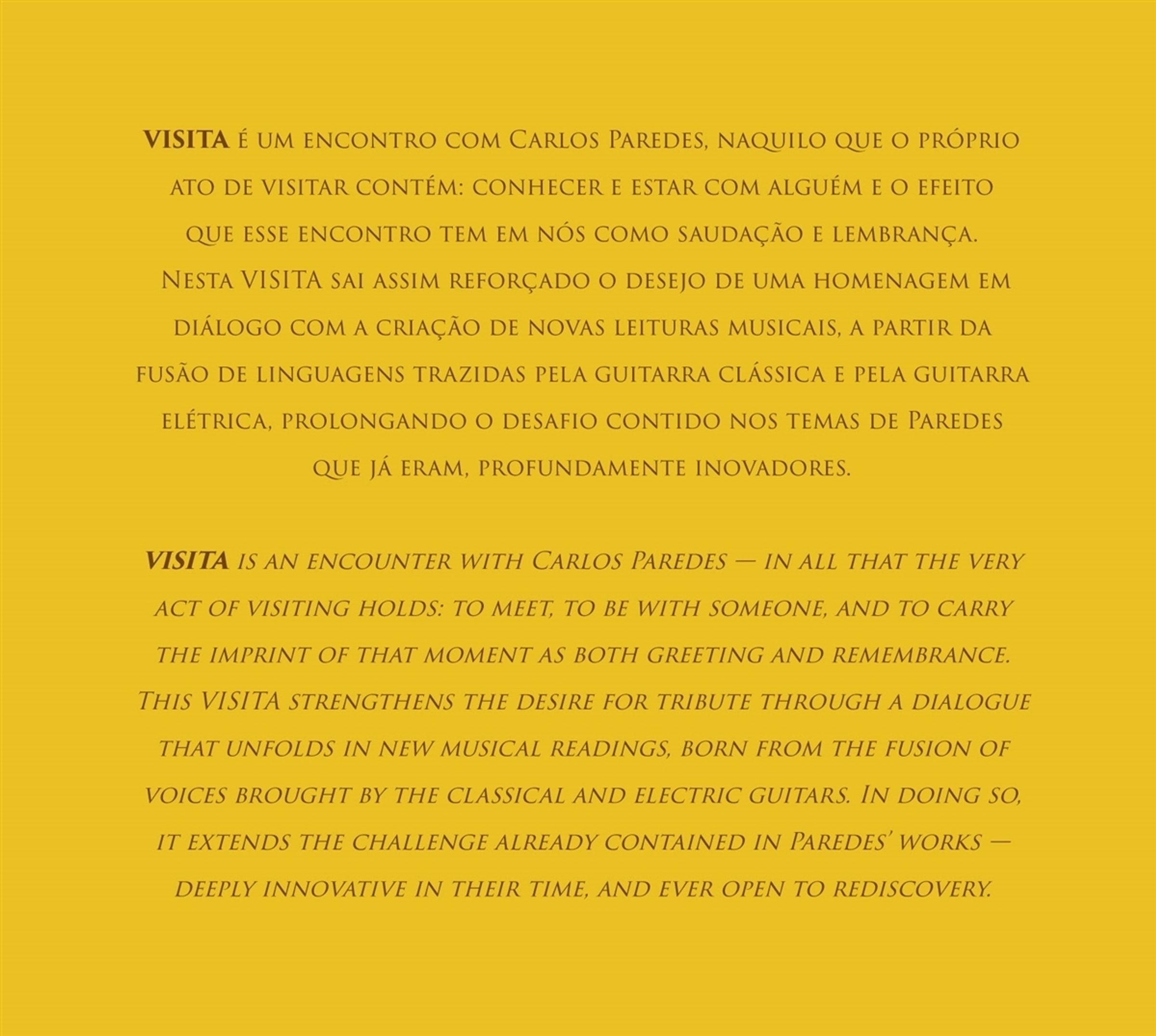 Anlässlich des hundertsten Geburtstags des renommierten portugiesischen Komponisten Carlos Paredes würdigen die Gitarristen José Peixoto und Nuno Cintrao das unsterbliche Vermächtnis seiner Musik mit einem gemeinsamen Album. Ausgehend von ihrer Arbeit als Duo Combinatorium, mit dem sie das Album Fragmentos Imaginarios" (2023) veröffentlichten, erforschen die Musiker nun das Klanguniversum des Meisters der portugiesischen Gitarre. Dabei lassen sie sich selbst großen Freiraum für Kreativität und