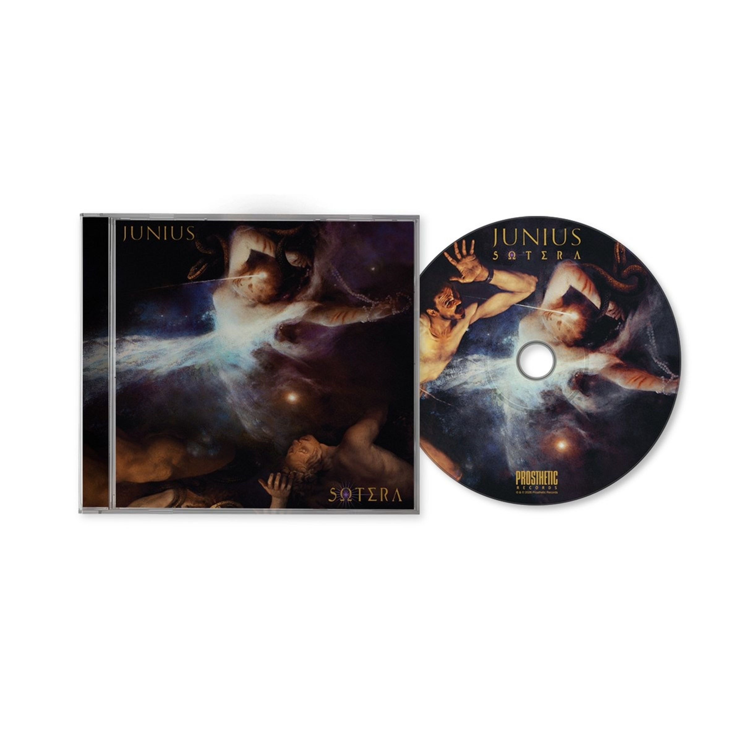 Texte: "Junius", "Sotera". Illustration eines dramatischen, mystischen Szenarios: Eine Figur mit Schlangen und Lichtstrahl., CD