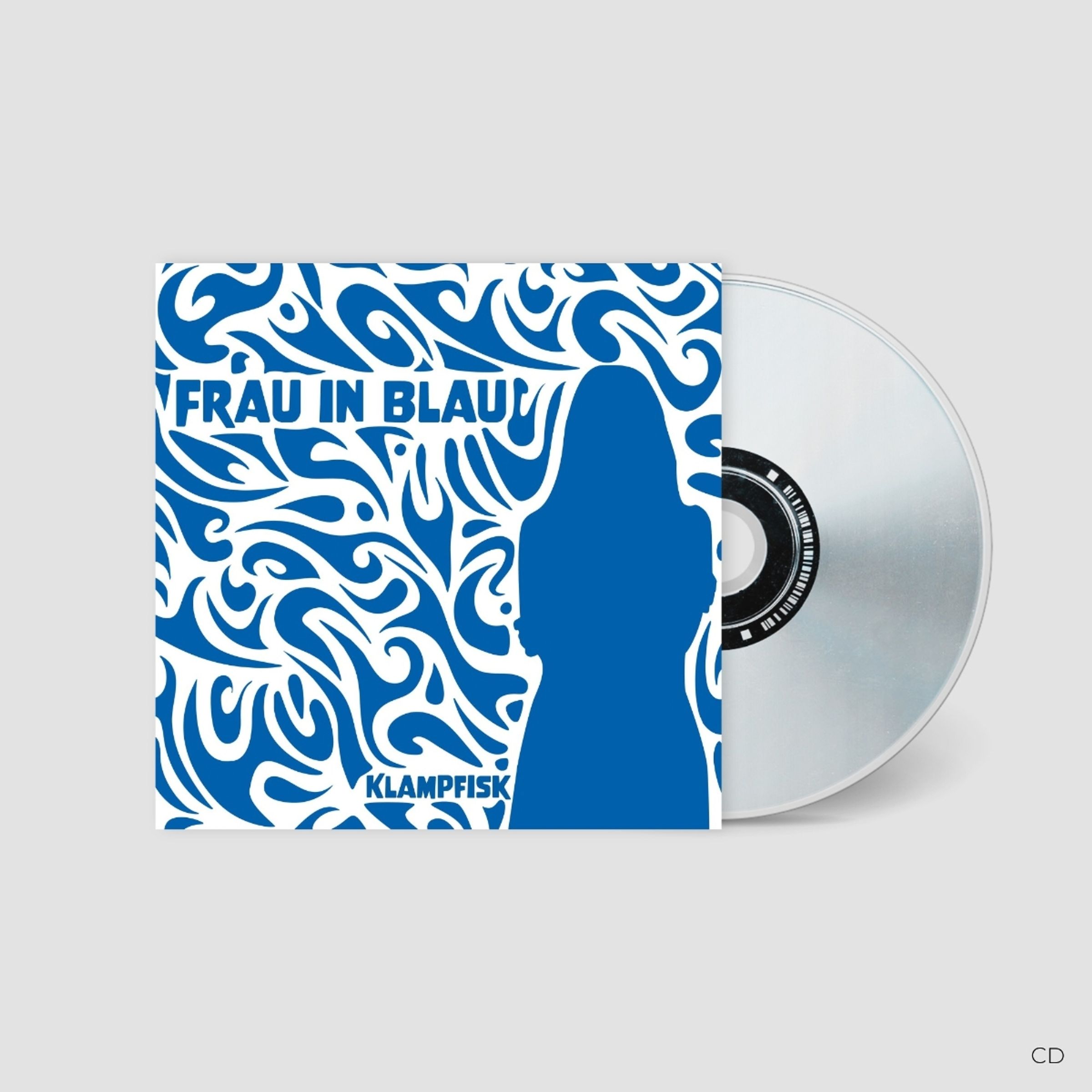 "FRAU IN BLAU" und "KLAMPFISK" in Großbuchstaben, vor blauen, geschwungenen Mustern und einer blauen Silhouette., CD