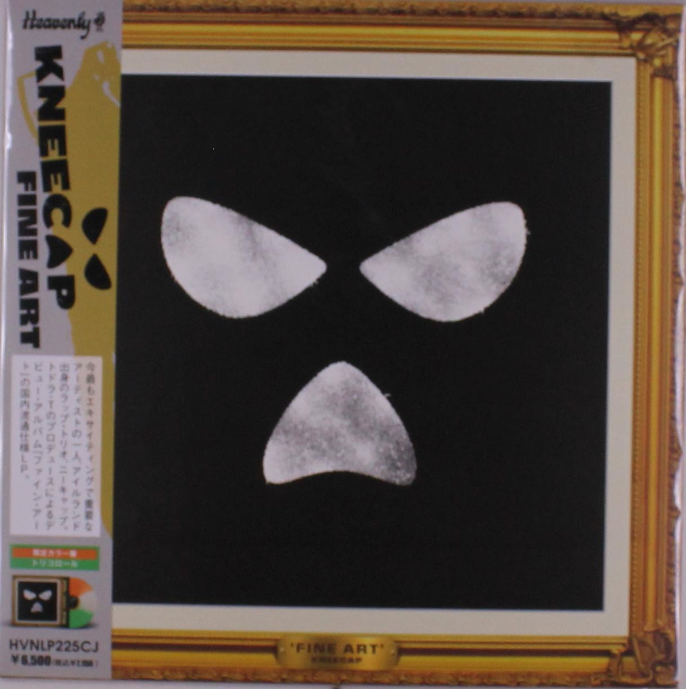 "Kneecap Fine Art" links, weiße abstrakte Formen auf schwarzem Hintergrund, goldener Rahmen., LP