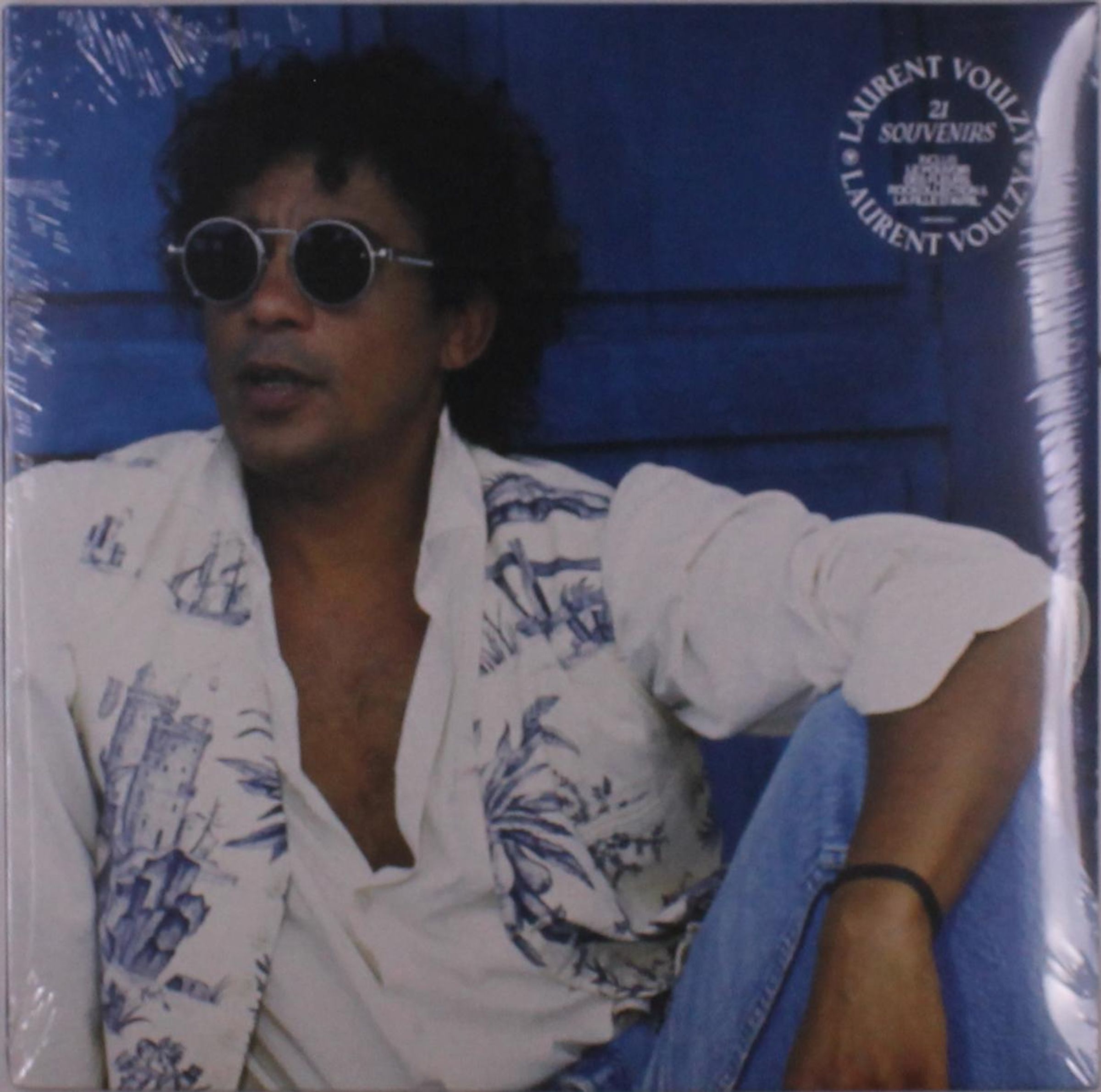 „LAURENT VOULZY 21 SOUVENIRS“ auf blauem Kreis. Person mit Sonnenbrille und gemusterter Weste sitzt lässig., 2 LPs