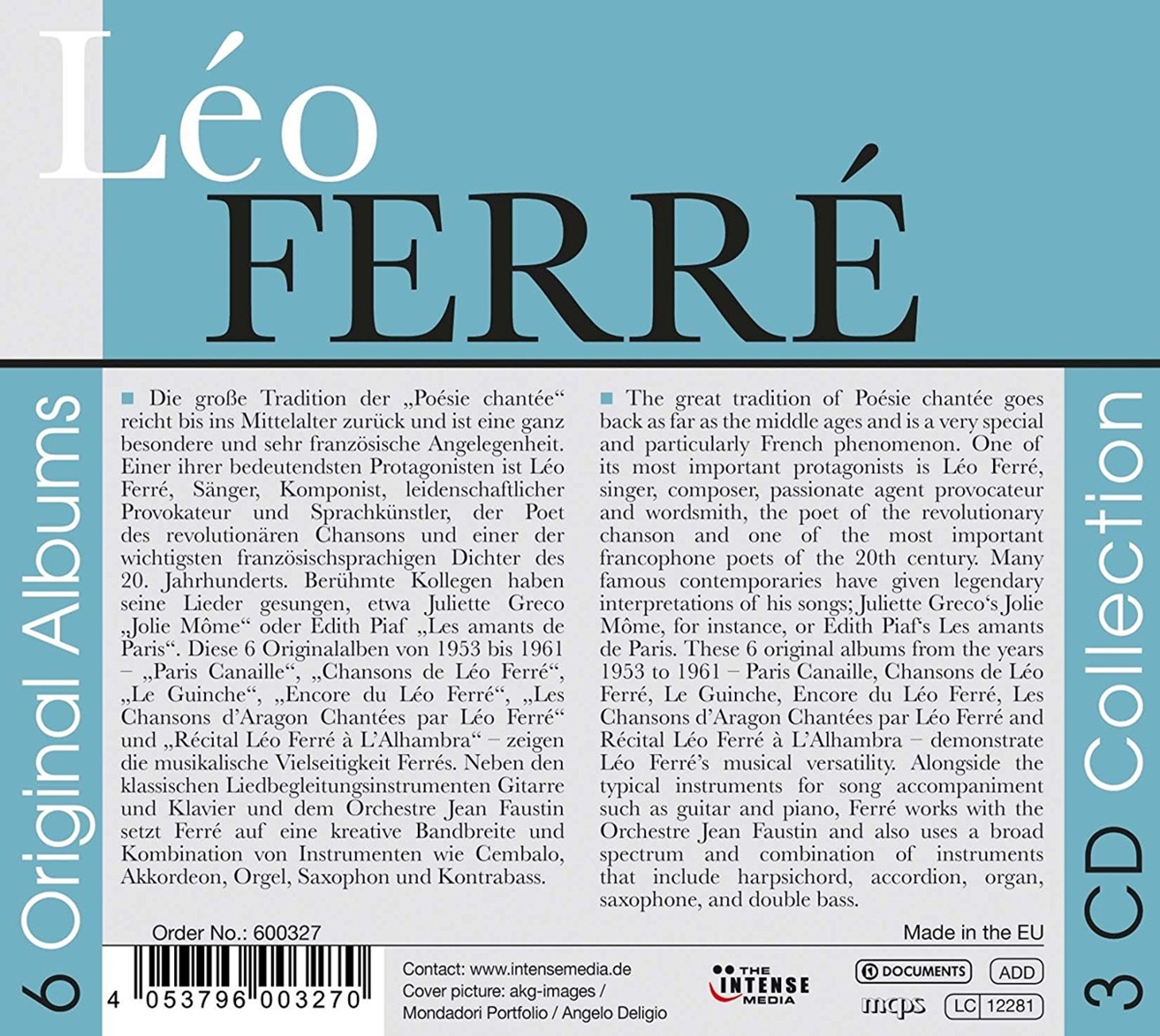 Diese 6 Originalalben von 1953 bis 1961 - „Paris Canaille“, „Chansons de Léo Ferré“, „Le Guinche“, „Encore du Léo Ferré“, „Les Chansons d’Aragon Chantées par Léo Ferré“ und „Récital Léo Ferré à L’Alhambra“ - zeigen die musikalische Vielseitigkeit Ferrés.