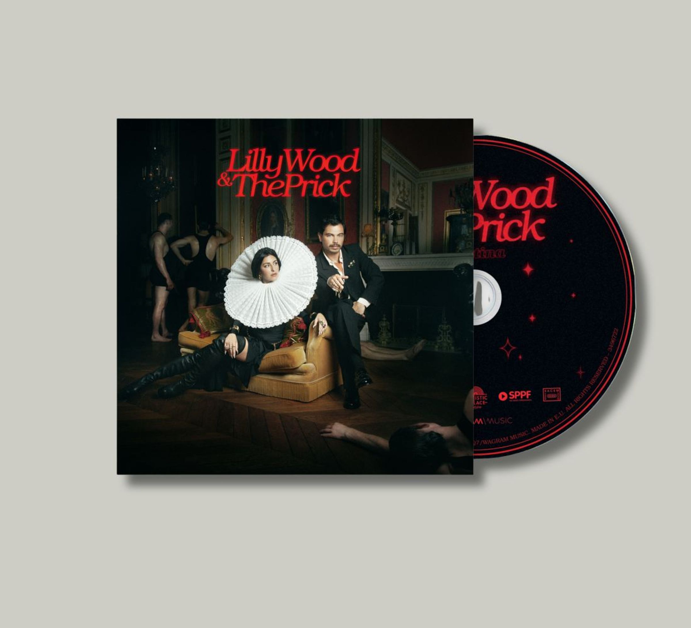 Text: "Lilly Wood & The Prick" in Rot. Zwei Personen auf einem Sofa in einem eleganten Raum, mit Leuten im Hintergrund., CD