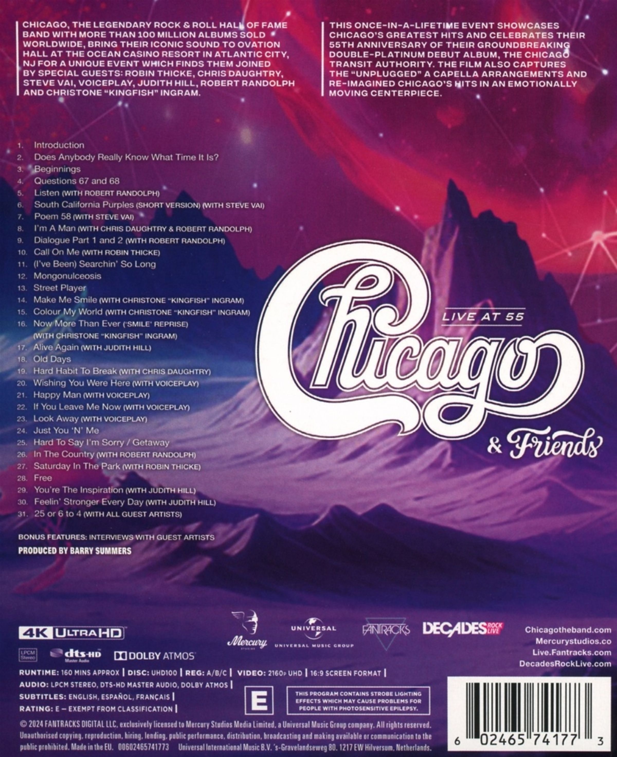 Dieses einmalige Ereignis präsentiert Chicagos größten Hits und feiert den 55. Jahrestag ihres bahnbrechenden Doppel-Platin-Debütalbums »The Chicago Transit Authority«. Der Film zeigt ebenfalls »unplugged« A-Capella-Arrangements und neu interpretierte Chicago-Hits in einem emotional bewegenden Mittelteil.