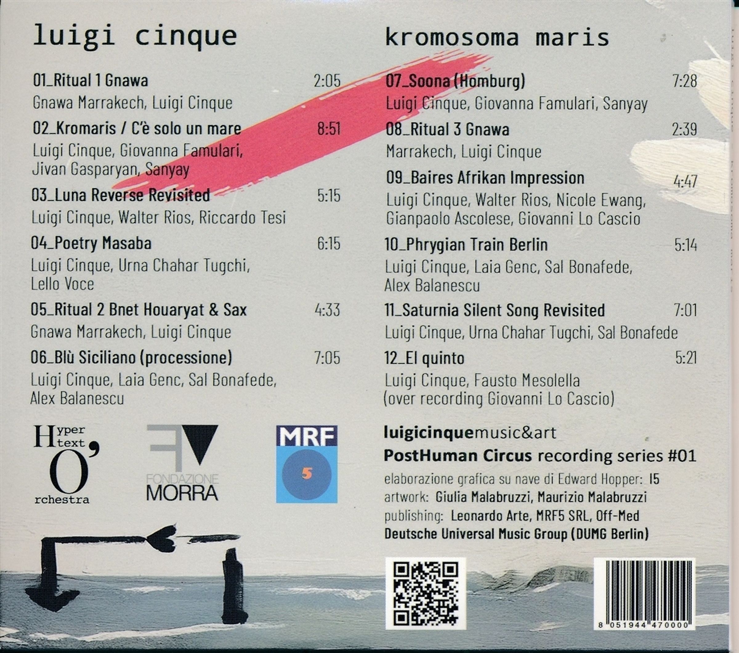 Luigi Cinque gilt als Urgestein der europäischen Weltmusik und darüber hinaus als Schlüsselfigur des zeitgenössischen und avantgardistischen Jazz. Sein neues Album ist eine persönliche Klangreise, die sich mit cineastischer Eleganz und einer Mischung aus komponierten Stücken und traditioneller Improvisation durch Raum und Zeit bewegt. Kromosoma Maris" ist ein vielseitiges Werk eines Multi-Instrumentalisten (Gesang, Sopransaxophon, Bassklarinette, Klavier, Elektronik). Es ist voller