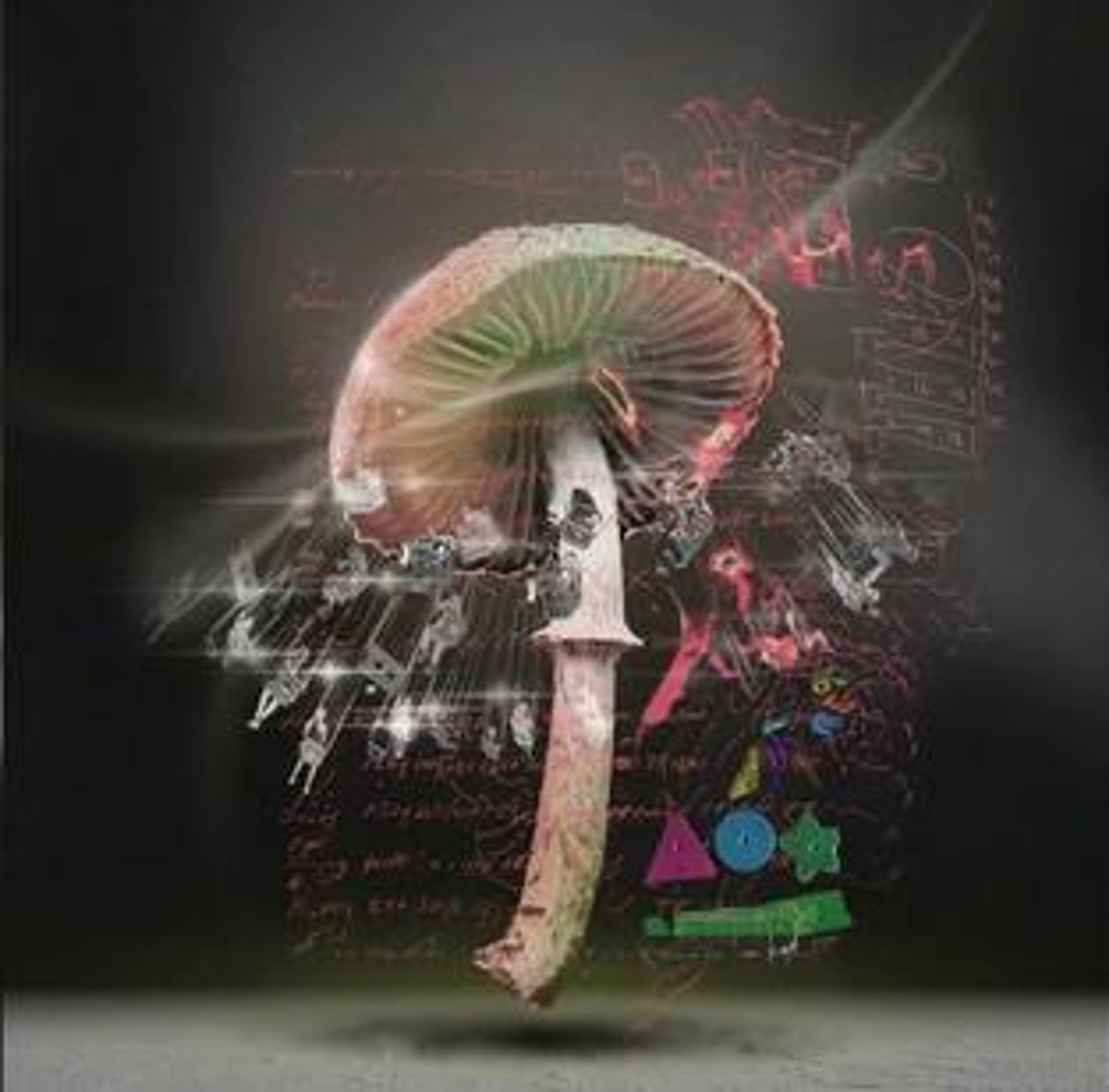 Ein zentraler Pilz mit grüner Kappe und pinken Akzenten, umgeben von bunten mathematischen Formeln und Symbolen., Single 12"