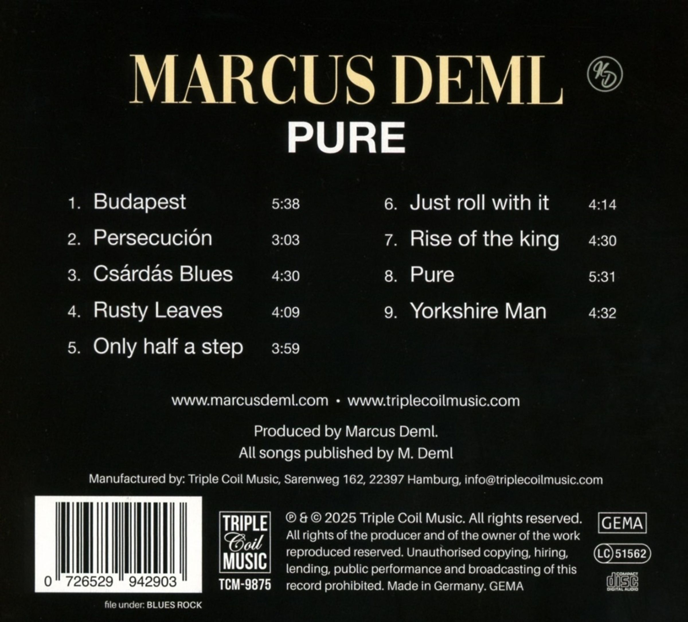 Seine Melodien erzählen Geschichten, die unmittelbar berühren. Mit »Pure« setzt er nun ein klares Statement als Solokünstler: eigenständig, charakterstark und unverwechselbar. Begleitet wird Marcus Deml von der Marcus Deml Group – Achim Rafain (Bass), Felix Dehmel (Drums) und Tom Aeschbacher (Keyboards). Für besondere Momente sorgen Gastbeiträge von Betty Balue (Vocals). Die Produktion zeichnet sich durch Transparenz und Wärme aus, jeder Ton atmet Authentizität. »Pure« ist weit mehr als ein Gitarrenalbum. Es ist eine Einladung, Musik mit offenen Ohren und Herzen zu erleben – eine Reise durch Klangwelten voller Virtuosität, Leidenschaft und Menschlichkeit.