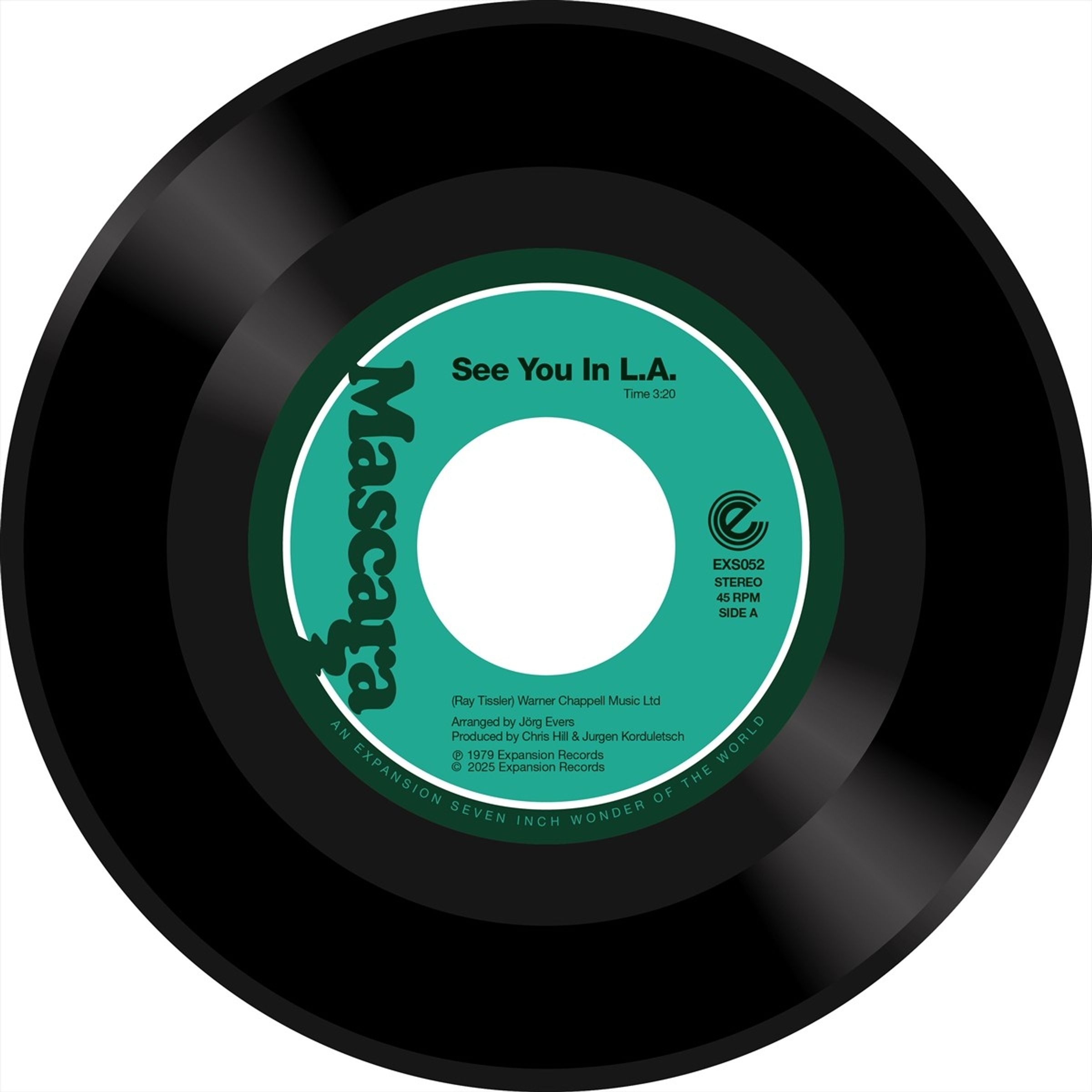 Schallplatten-Druck "See You In L.A.", "Mascara", grün-schwarzes Design mit mittigem Loch und kreisförmigem Text., Single 7"