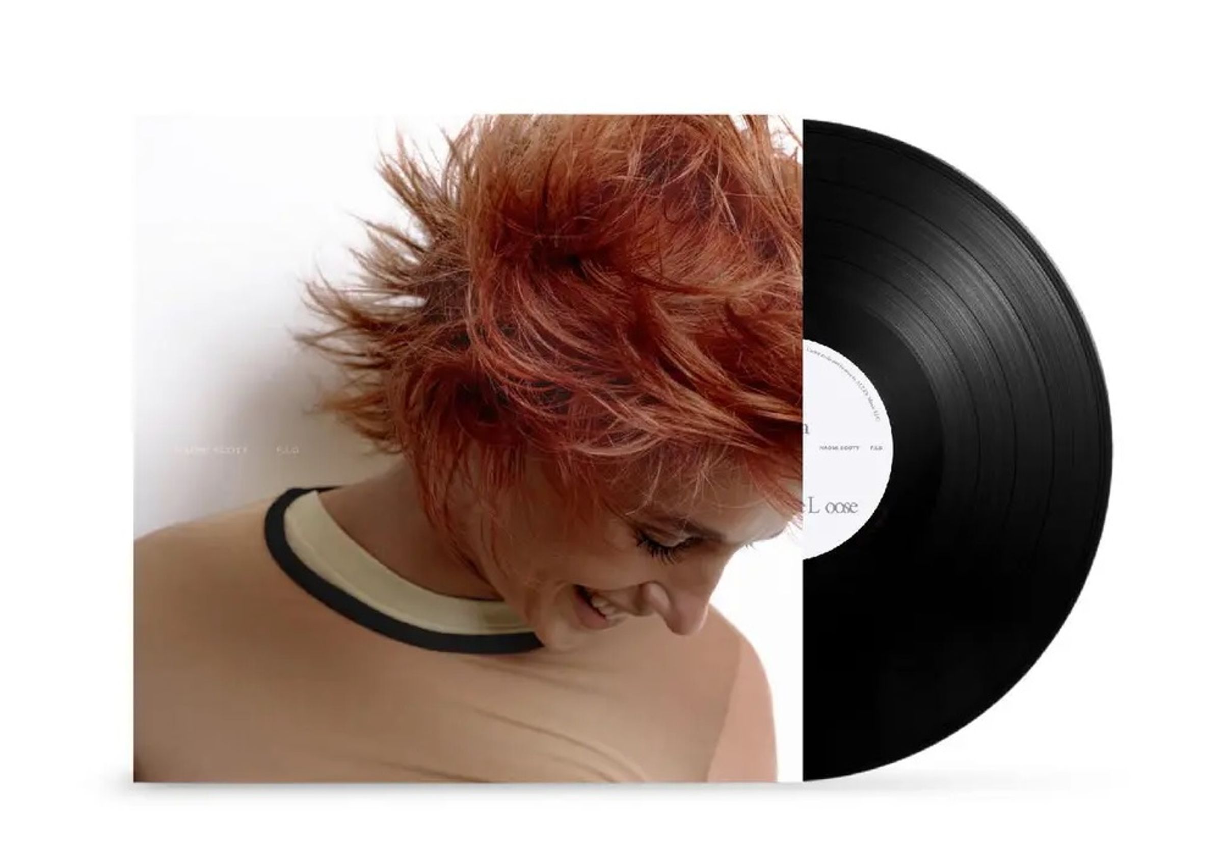 Text: "NAOMI SCOTT F.I.G" Eine Person mit kurzem, rotbraunem, wildem Haar lächelt und blickt nach unten. Sie trägt ein beige Shirt., LP