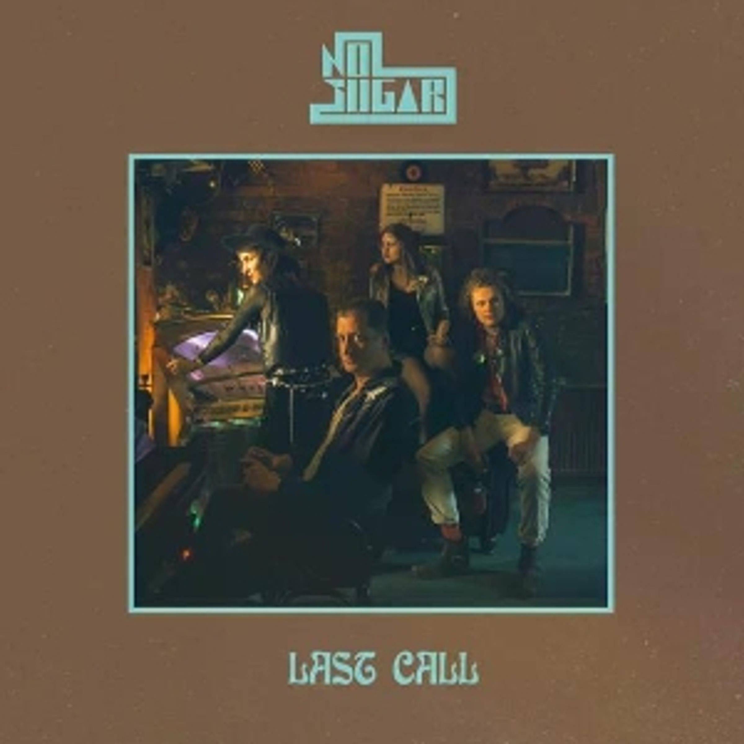 Text oben: "NO SUGAR". Text unten: "LAST CALL". Vier Personen in einem Raum mit Retro-Flair., LP