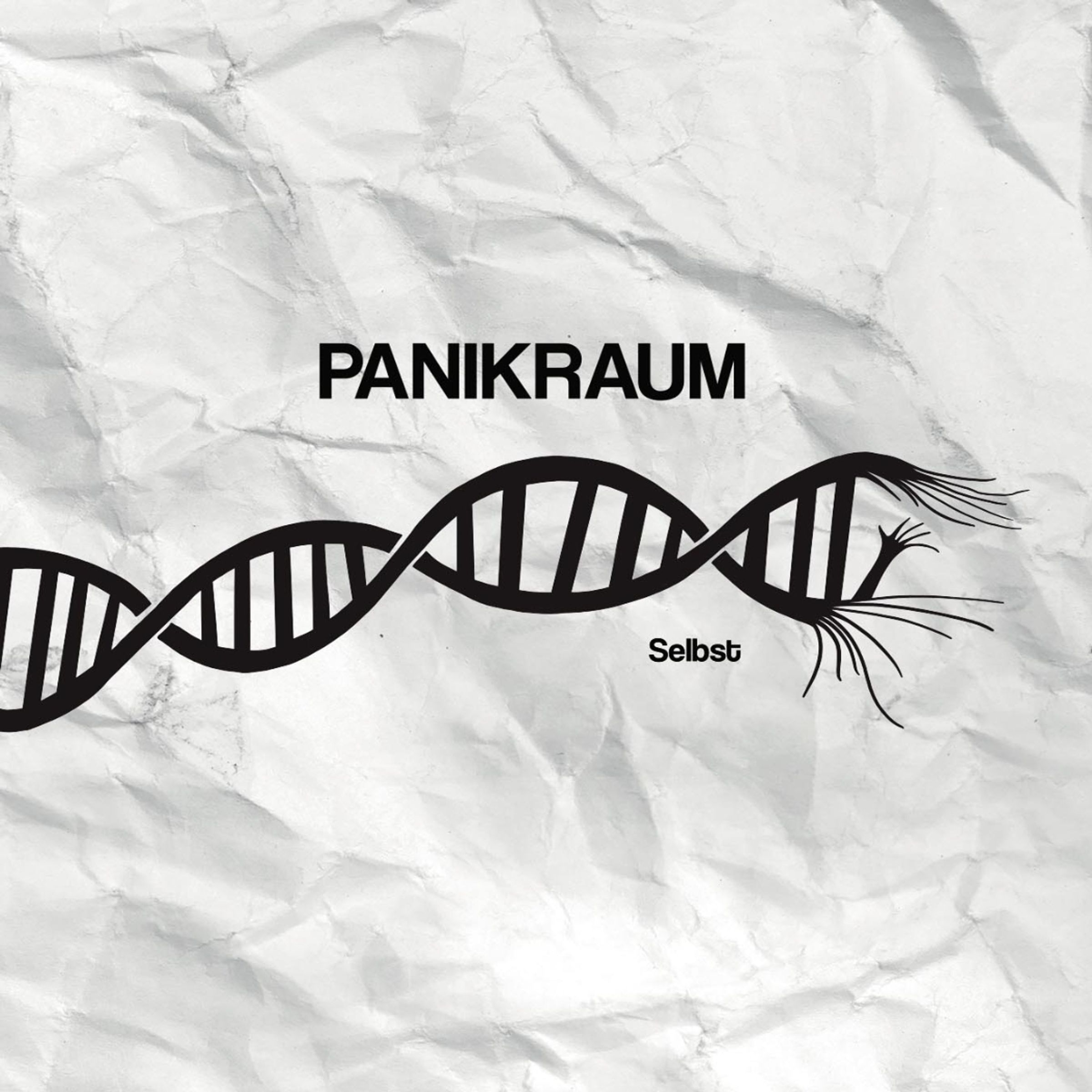 Text „PANIKRAUM Selbst“. Illustration einer DNA-Helix auf zerknittertem Hintergrund., LP