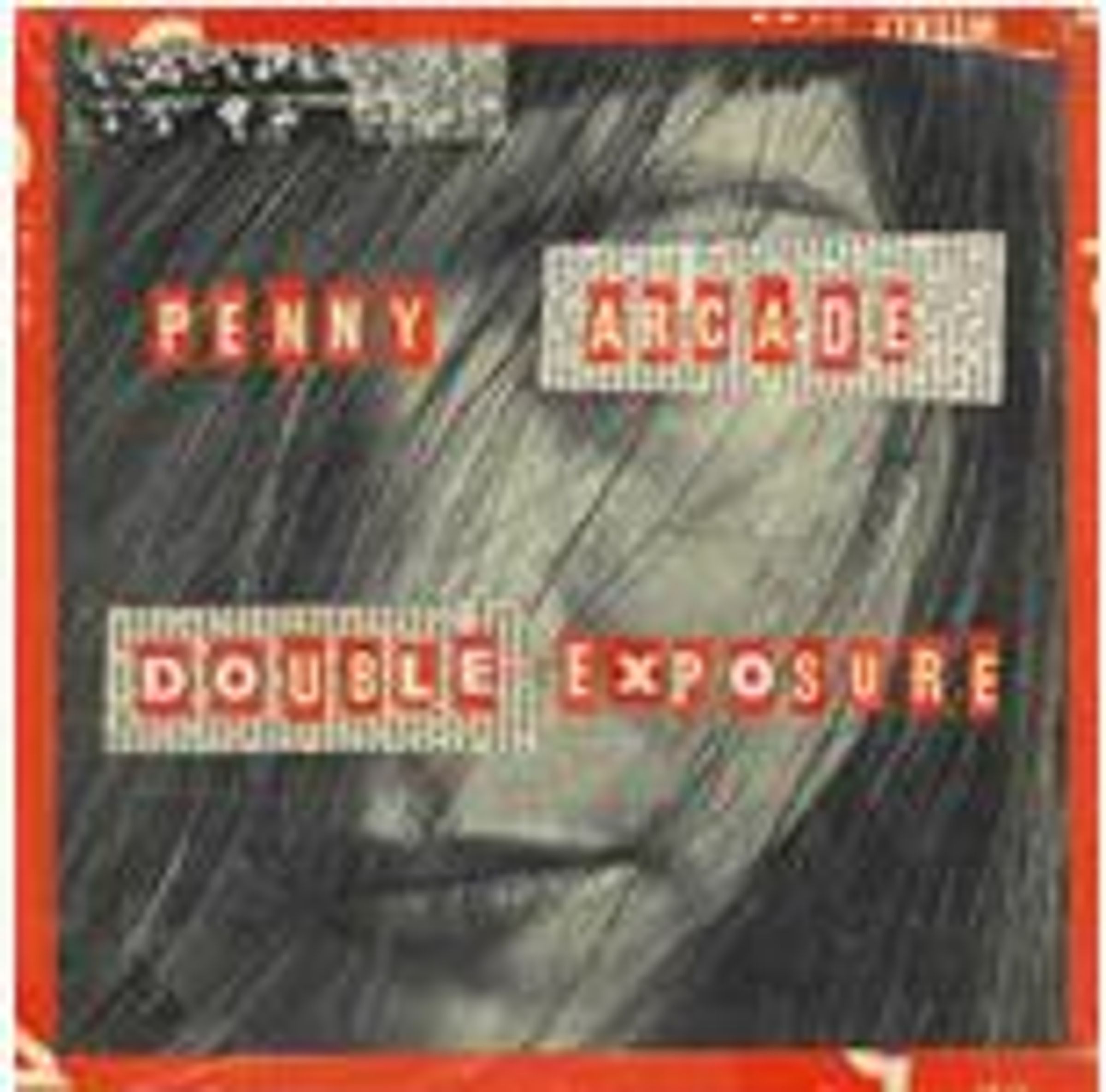 "Penny Arcade Double Exposure" steht auf einer Platte mit Collagenstil, Gesicht und Fotografien, teils rot umrandet., LP