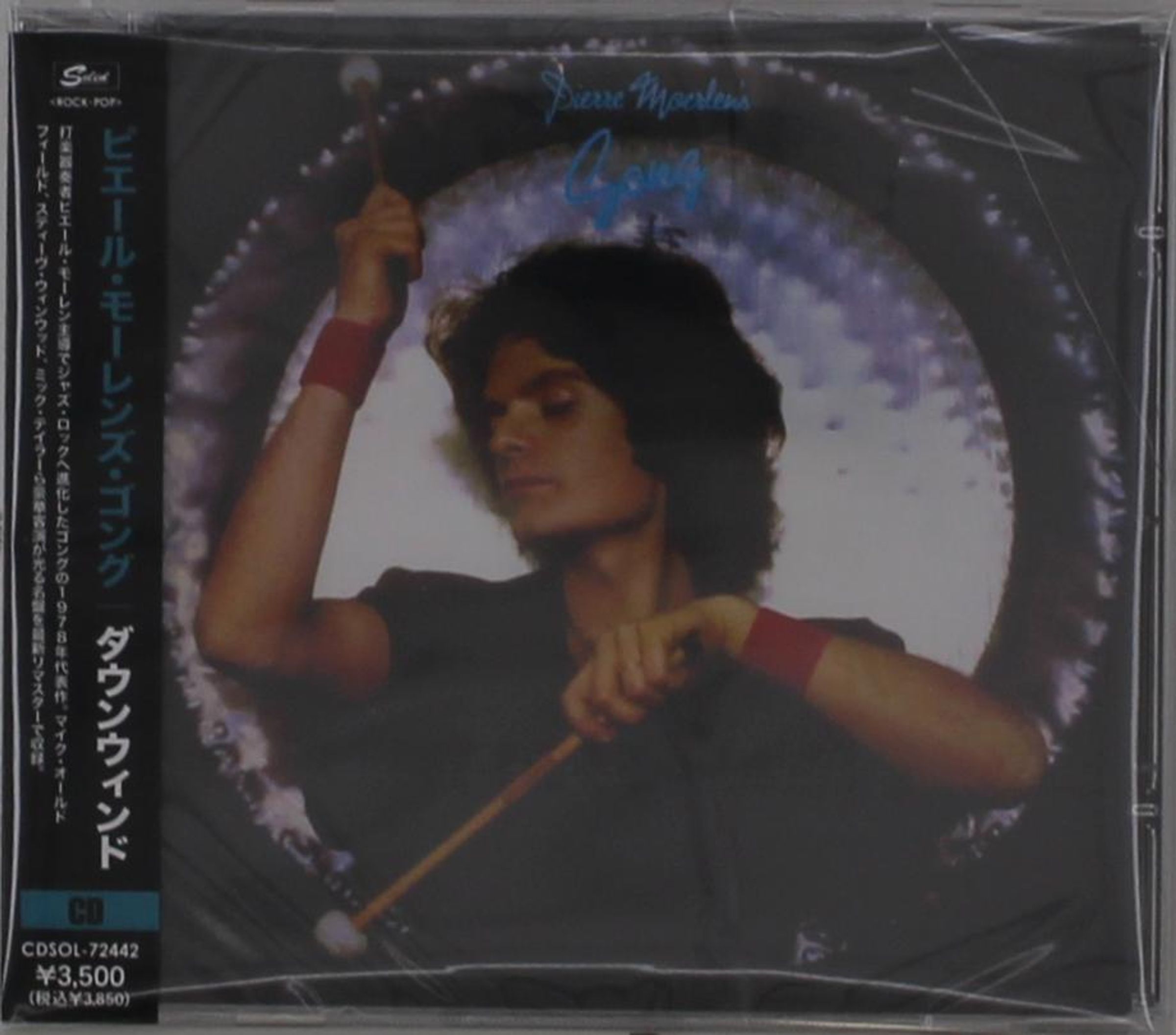 Texte: Japanische Schriftzeichen, "Pierre Moerlen's Gong", "Down Wind". Person spielt ein Instrument mit Schlägel., CD
