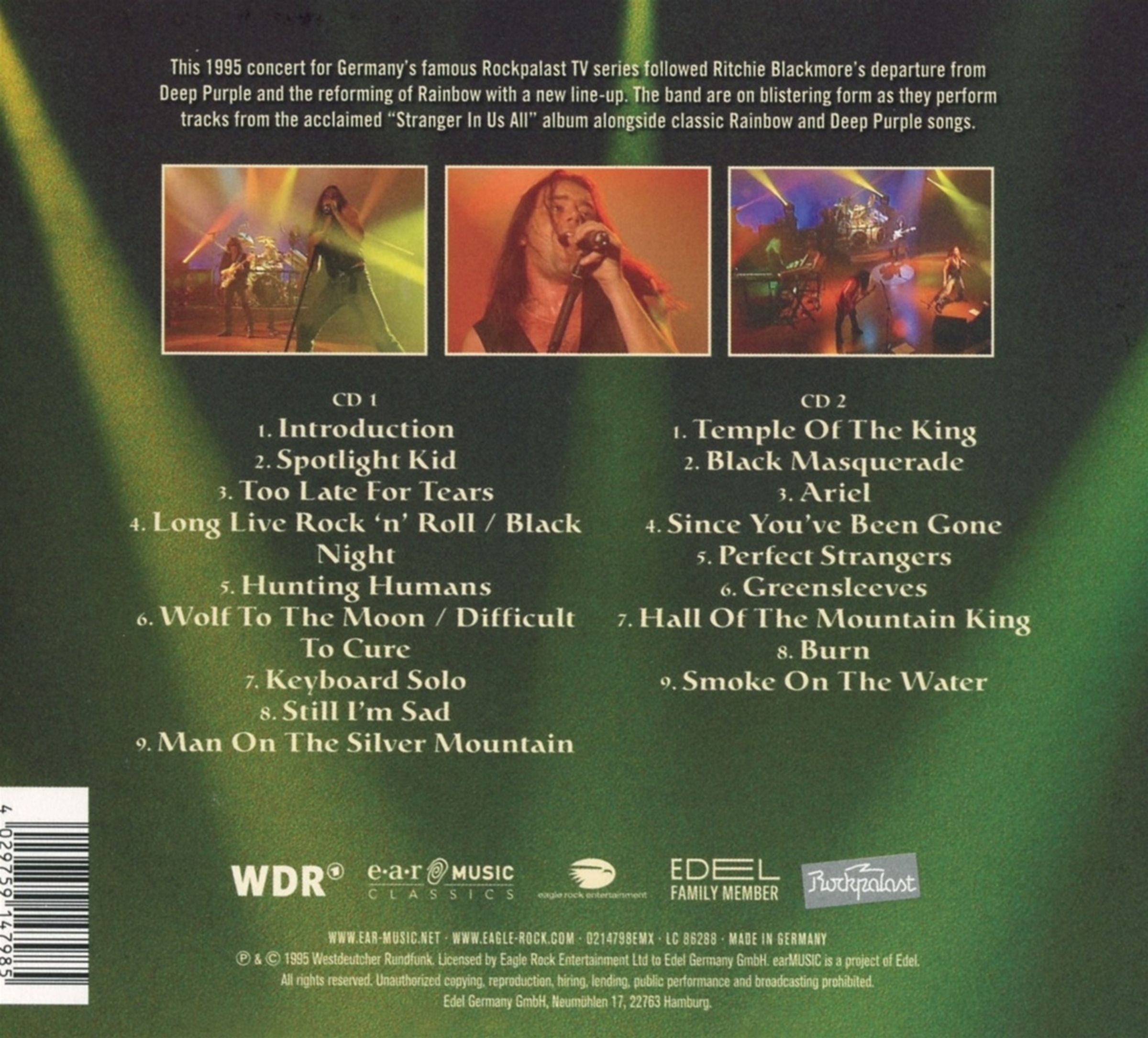 Dieses Konzert, 1995 für Deutschlands berühmte Fernsehserie »Rockpalast« aufgenommen, wurde ursprünglich 2013 veröffentlicht und folgte auf Ritchie Blackmores Abschied von Deep Purple und der Reformierung von Rainbow mit einer neuen Besetzung.