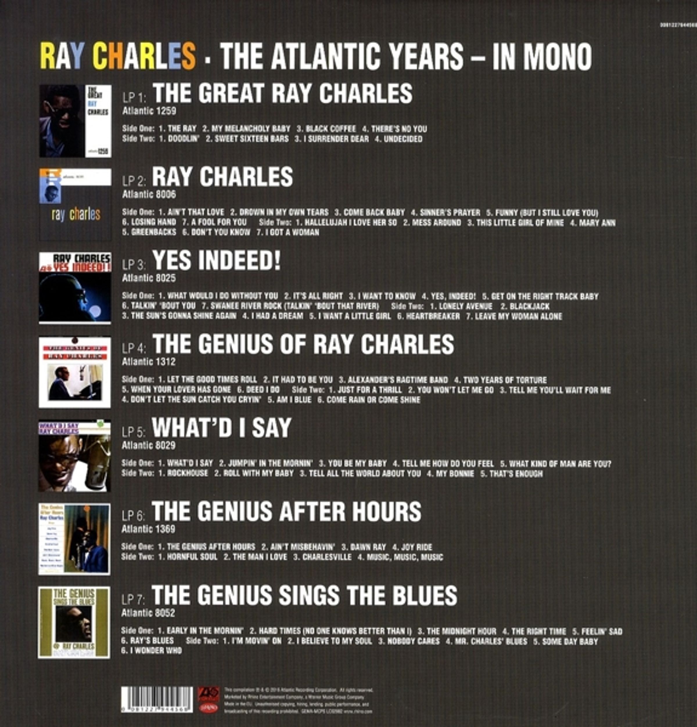 Mit The Atlantic Years In Mono gedenkt Atlantic Records dieses außergewöhnlichen Mannes und Musikers, der im September 86 Jahre alt geworden wäre, nun mit einer umfangreichen 7 LP-Box, welche die Atlantic-Alben The Great Ray Charles, Ray Charles, Yes Indeed!, The Genius Of Ray Charles, What I'd Say, The Genius After Hours und The Genius Sings The Blues enthält.