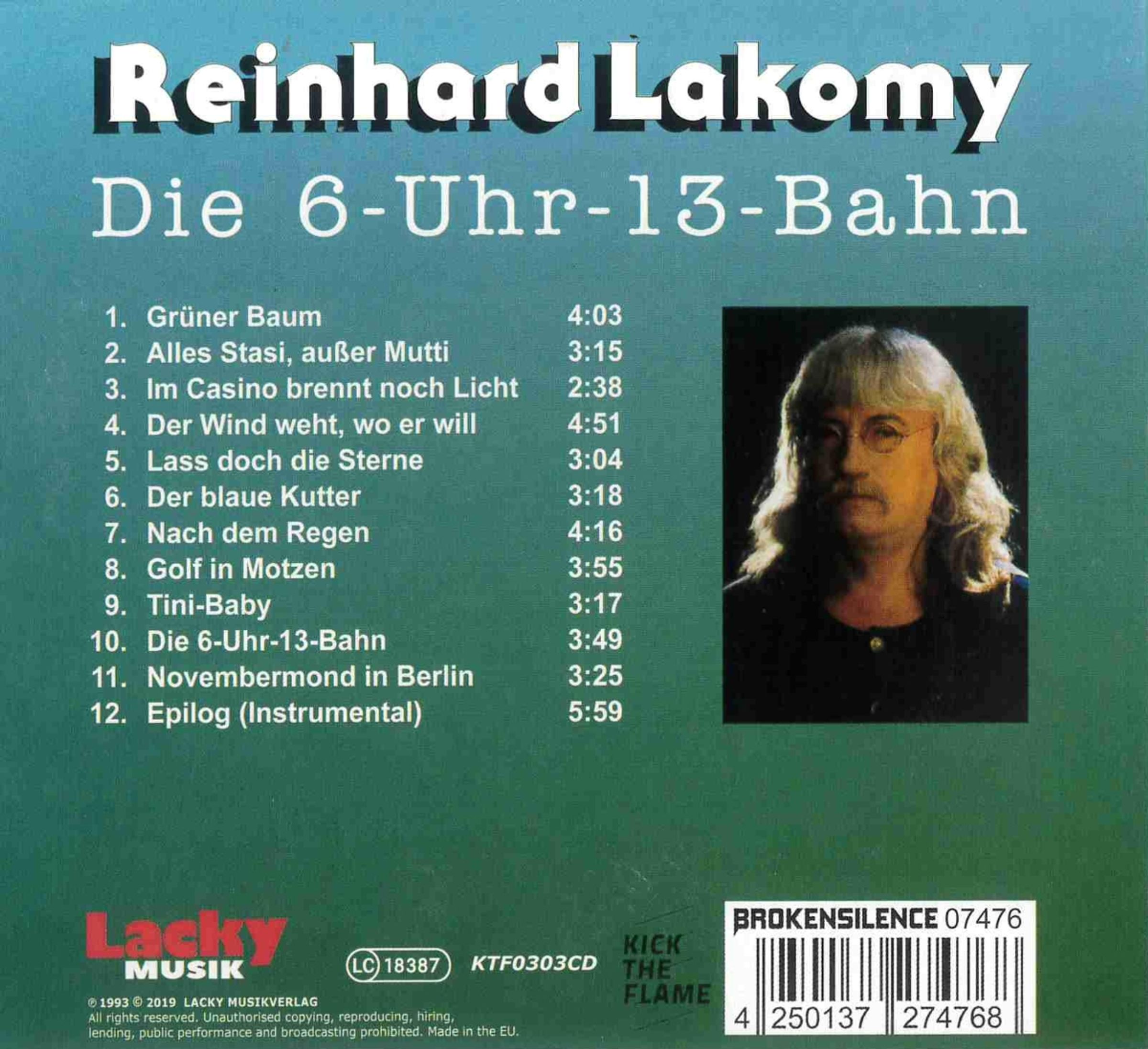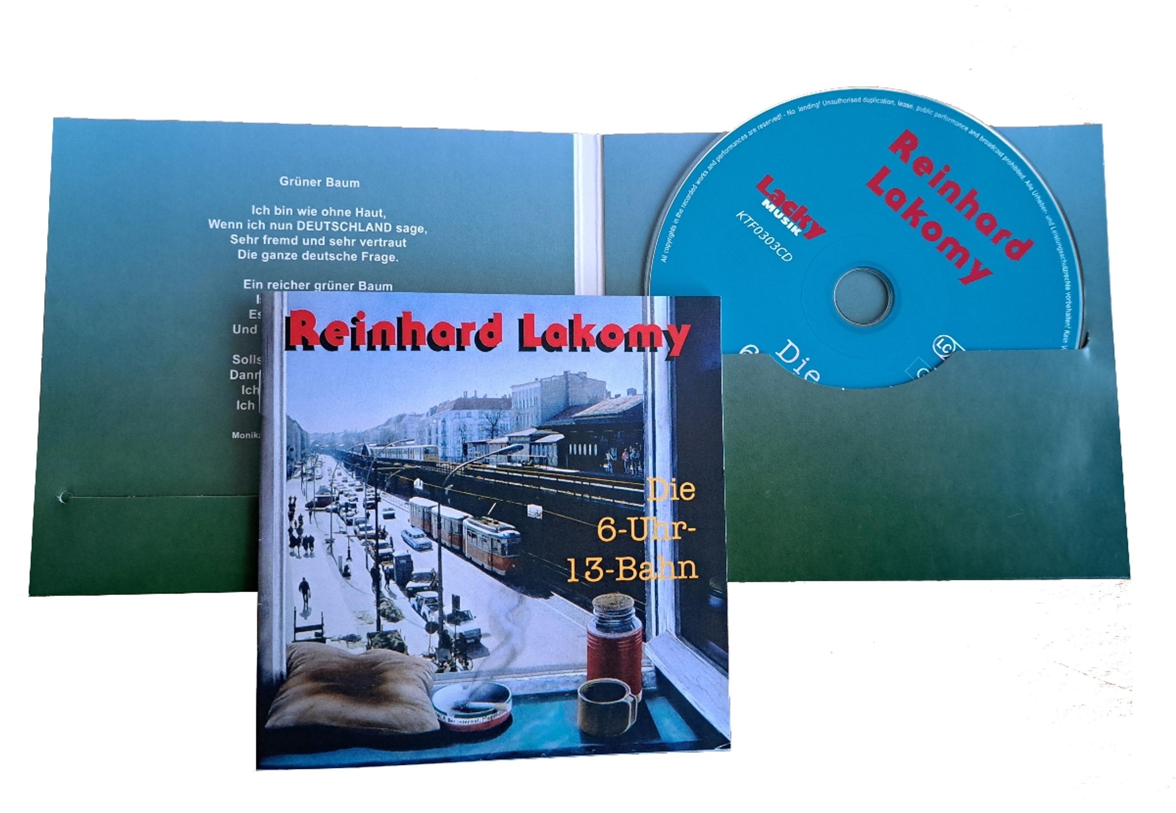 Gut vier Jahre nach dem Mauerfall entstand das zwölf Songs umfassende „Die 6-Uhr-13-Bahn“, auf dem LAKOMY Texte seiner Frau MONIKA EHRHARDT sang und vertonte und musikalisch in neue Sphären vorstieß. Zwischen Liedermacherei, Elektronik und Rock bewegen sich die Songs, die LAKOMY wegen des kritischen Tonfalls den Vorwurf der „Ostalgie“ einbrachten. RICHARD VON WEIZSÄCKER hingegen verstand die Lieder so gut, dass er dem Ehepaar darauf einen persönlichen Brief schrieb. Nachdem das selbst produzierte Werk 1993 über BUSCHFUNK erschien, ist es jetzt endlich wieder erhältlich.