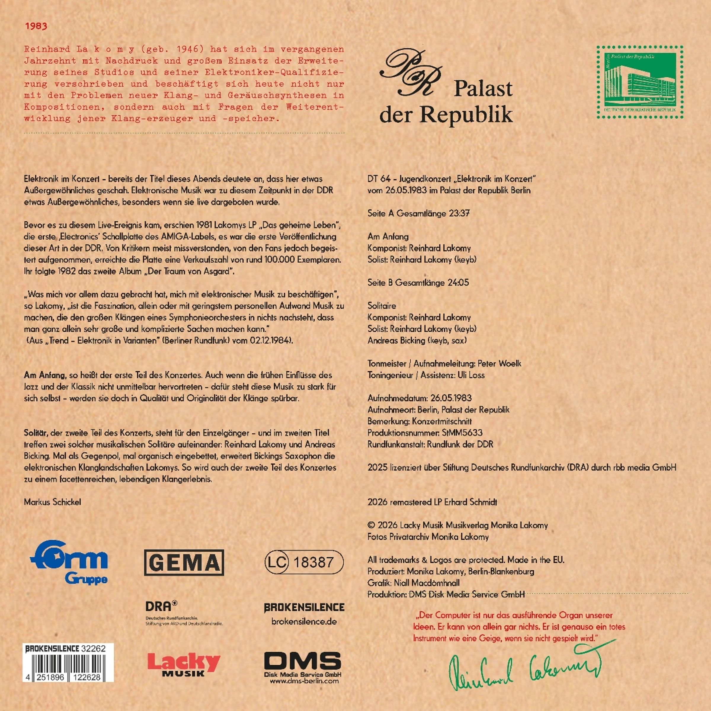 Das Konzert beginnt mit „Am Anfang“ (A-Seite). Auch wenn Lackys frühen Einflüsse aus Jazz und Klassik nicht unmittelbar hervortreten - dafür steht diese Musik zu stark für sich selbst - werden sie doch in Qualität und Originalität der Klänge spürbar. „Solitär“, der zweite Teil des Konzerts auf der B-Seite, steht für den Einzelgänger - und so treffen hier zwei solche musikalischen Solitäre aufeinander: Reinhard Lakomy und Andreas Bicking (u. a. Uschi Brüning, Veronika Fischer, Manfred Krug, Stern-Combo Meißen). Mal als Gegenpol, mal organisch eingebettet, erweitert Bickings Saxophon die elektronischen Klanglandschaften Lakomys. So wird auch der zweite Teil des Konzertes zu einem facettenreichen, lebendigen Klangerlebnis!