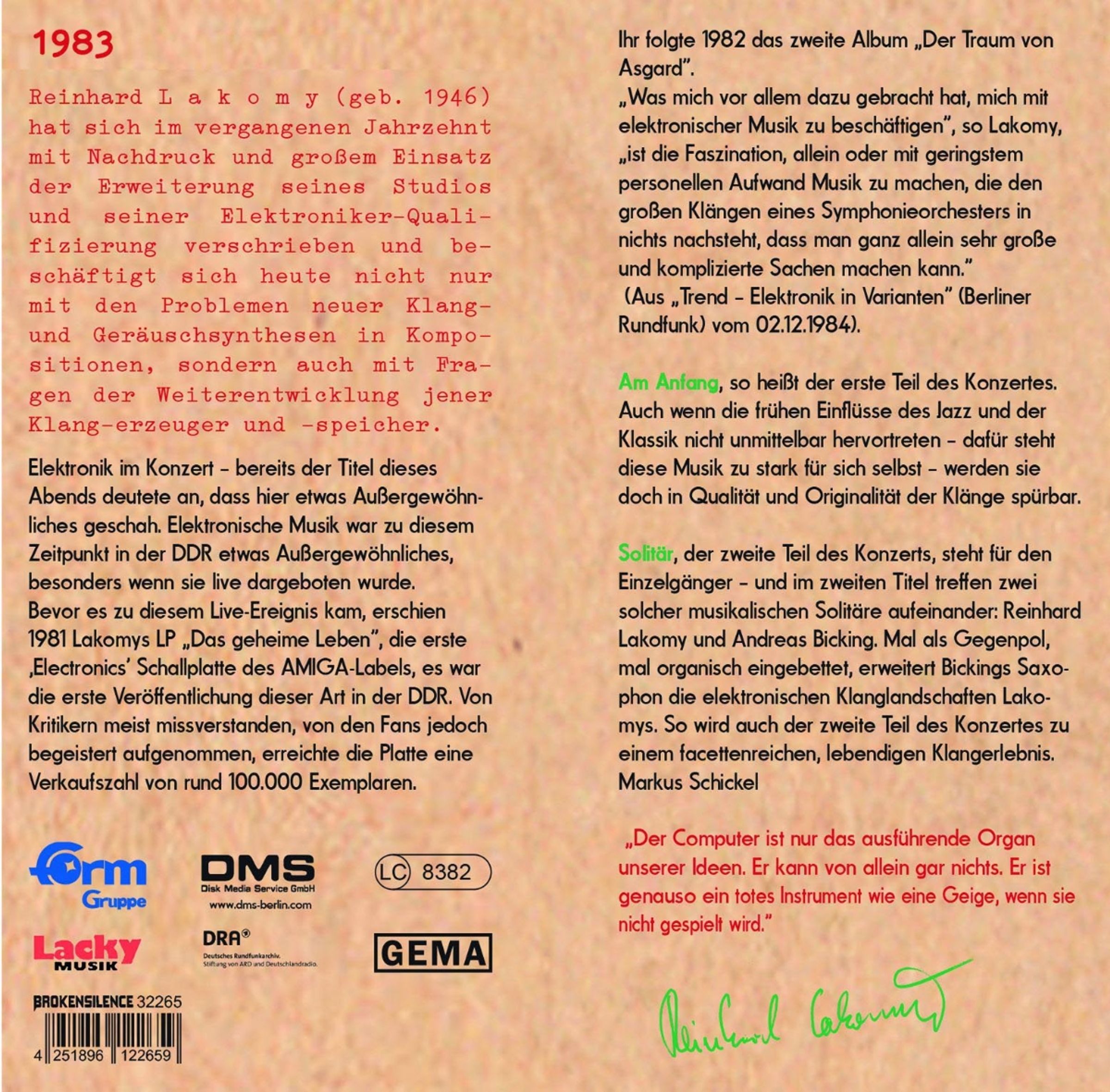 Der 2013 verstorbene Komponist, Arrangeur, Pianist und Sänger schuf von Jazz, Rock, Pop, Schlager, Filmmusik und Elektronik bis hin zu Hörspielen und Kindermusik einen riesigen Katalog weitbekannter Musik. Die Geschichtenlieder »Der Traumzauberbaum«, die er aus Monika Ehrhardts Texten erschuf, machten ihn zumindest östlich der Elbe unsterblich. »Lacky« war ein Pionier, zum Zeitpunkt dieser Liveaufnahme für das Jugendradio DT64 hatte er gerade erst auf Amiga die allerersten Elektronik-Musikaufnahmen der DDR veröffentlicht, von Kritikern beäugt, von Fans gefeiert. Das Konzert beginnt mit »Am Anfang« (A-Seite). Auch wenn Lackys an Jazz und Klassik geschulte Virtuosität nicht im Vordergrund steht - dafür steht dieser Sound zu stark für sich selbst - wird sie doch in Qualität und Originalität der Klänge spürbar.