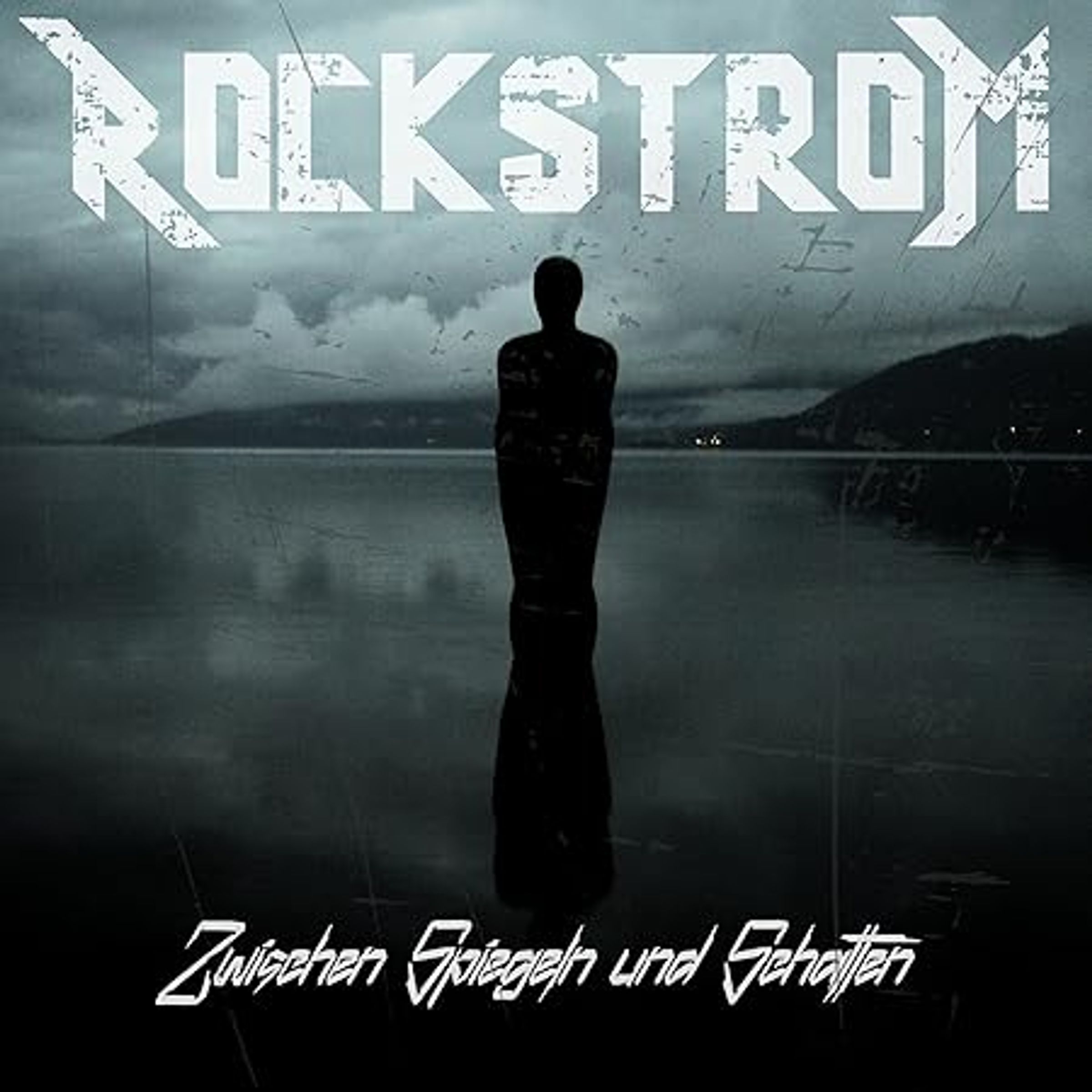 "ROCKSTROM" oben in großer Schrift, "Zwischen Spiegeln und Schatten" unten. Dunkle Figur am Wasser, neblige Atmosphäre., CD