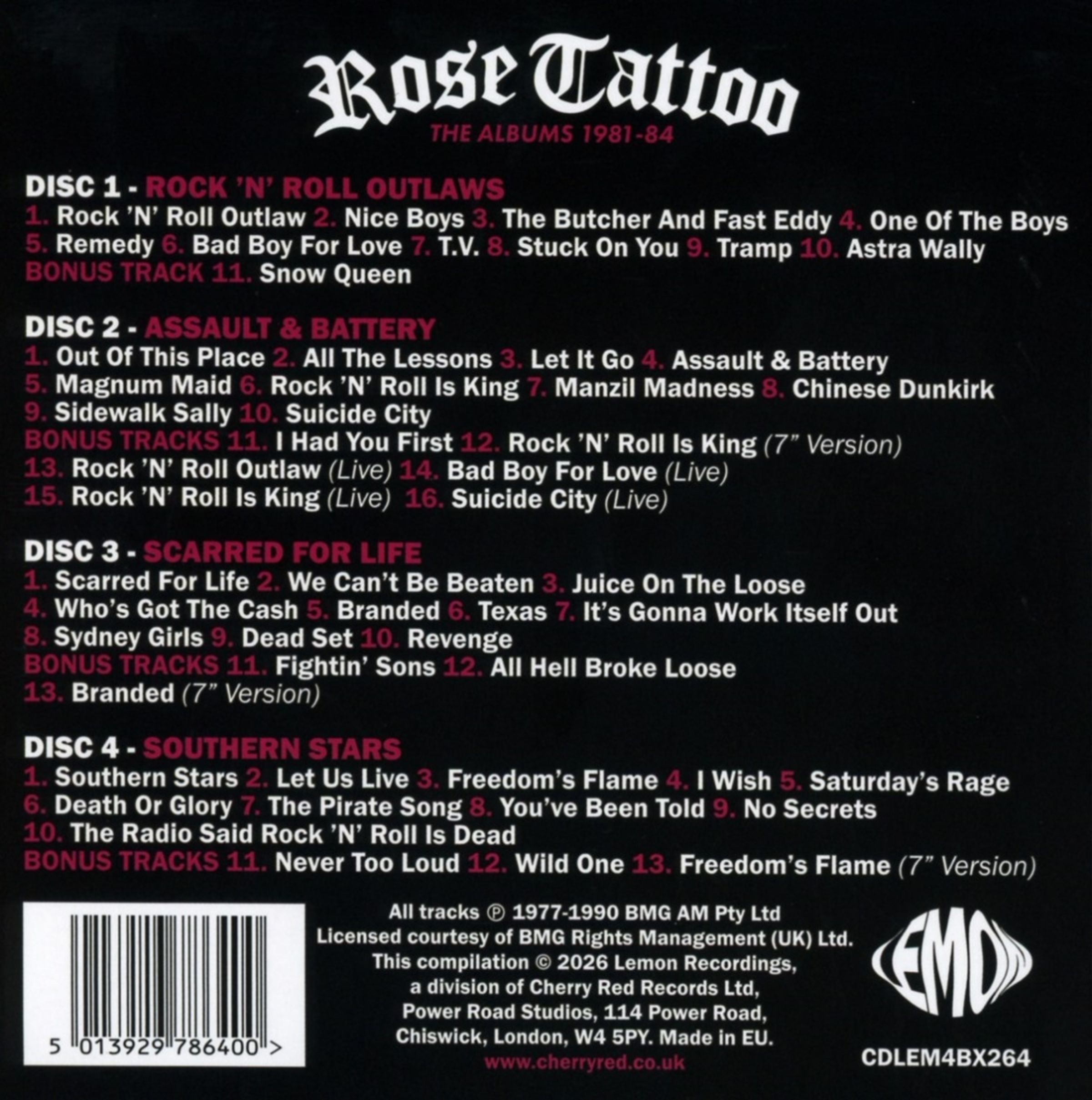 Die australischen Street-Rock-Legenden Rose Tattoo stehen im Mittelpunkt dieser 4-CD-Box mit 53 Titeln, die alle ihre Veröffentlichungen von 1977 bis 1984 vereint.