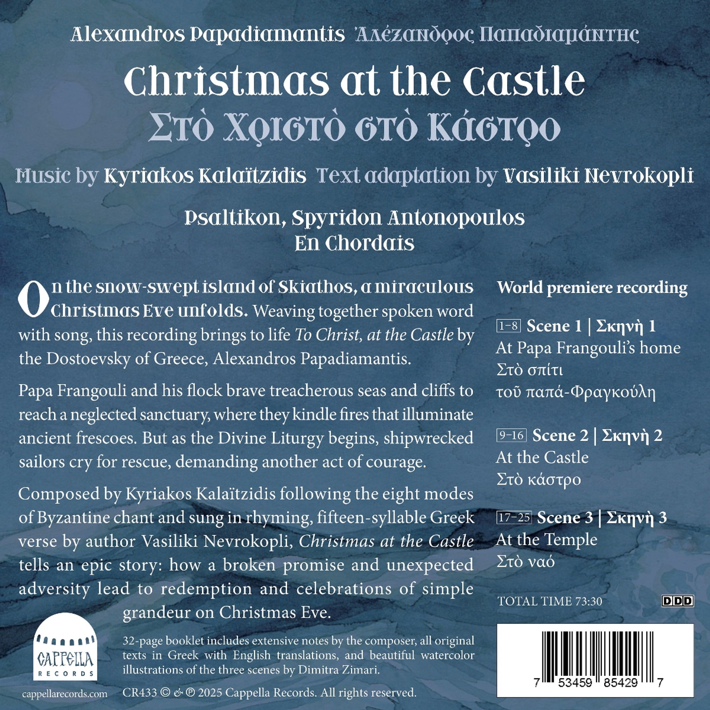 Auf der schneebedeckten Insel Skiathos ereignet sich ein wundersamer Heiligabend. Diese Aufnahme verbindet gesprochene Worte mit Gesang und erweckt "Christ at the Castle" von Alexandros Papadiamantis, dem Dostojewski Griechenlands, zum Leben. Papa Frangouli und seine Gemeinde trotzen den tuckischen Meeren und Klippen, um ein verlassenes Heiligtum zu erreichen, wo sie ein Feuer entfachen, das die alte Fresken beleuchtet. Doch als die Gottliche